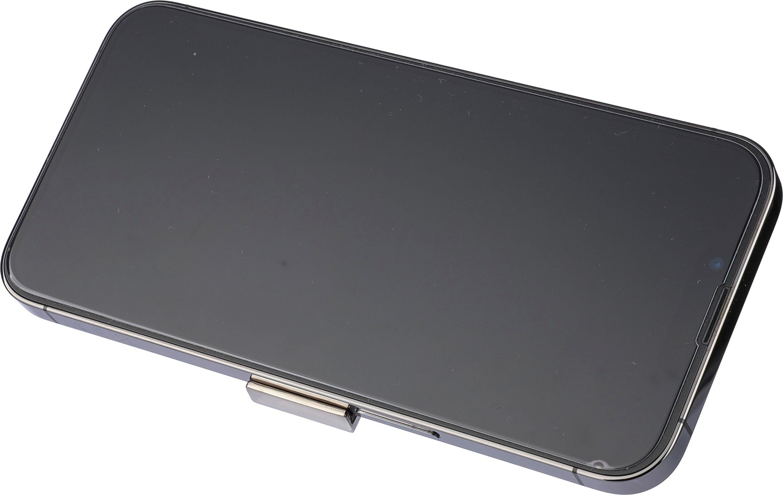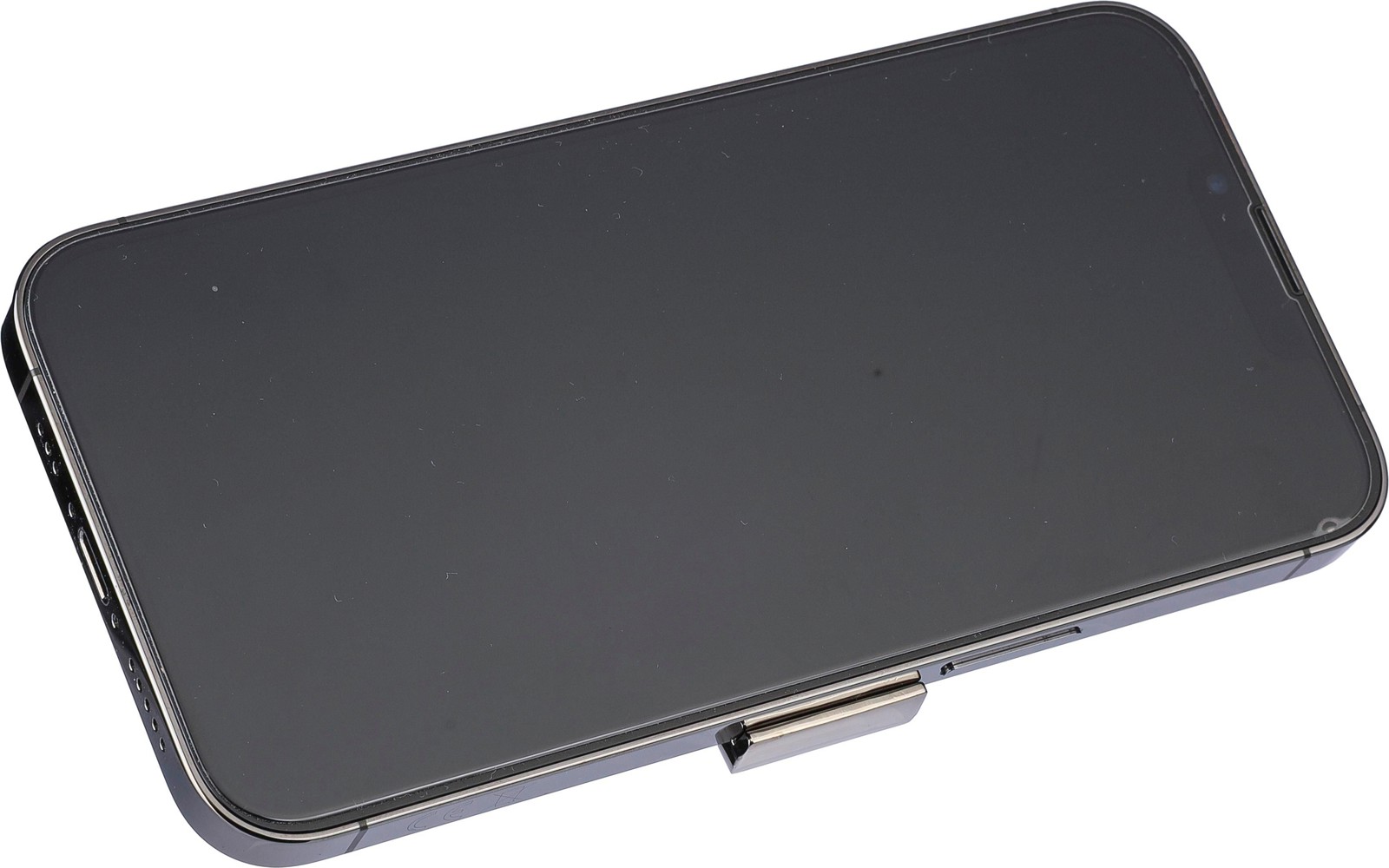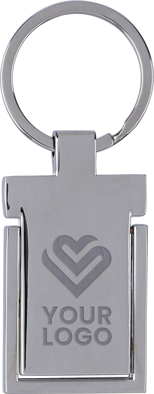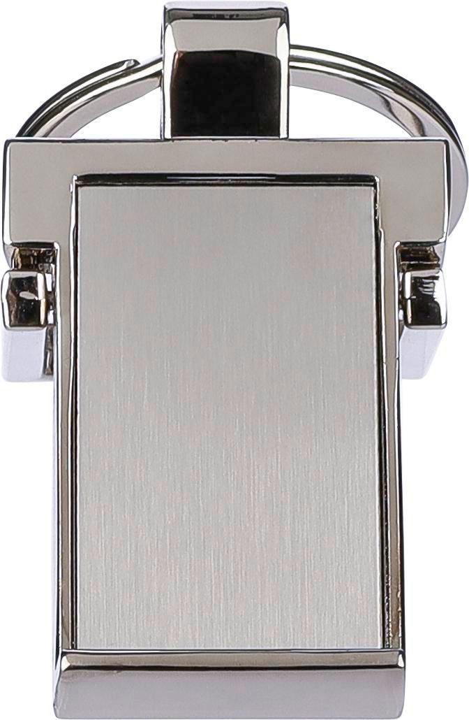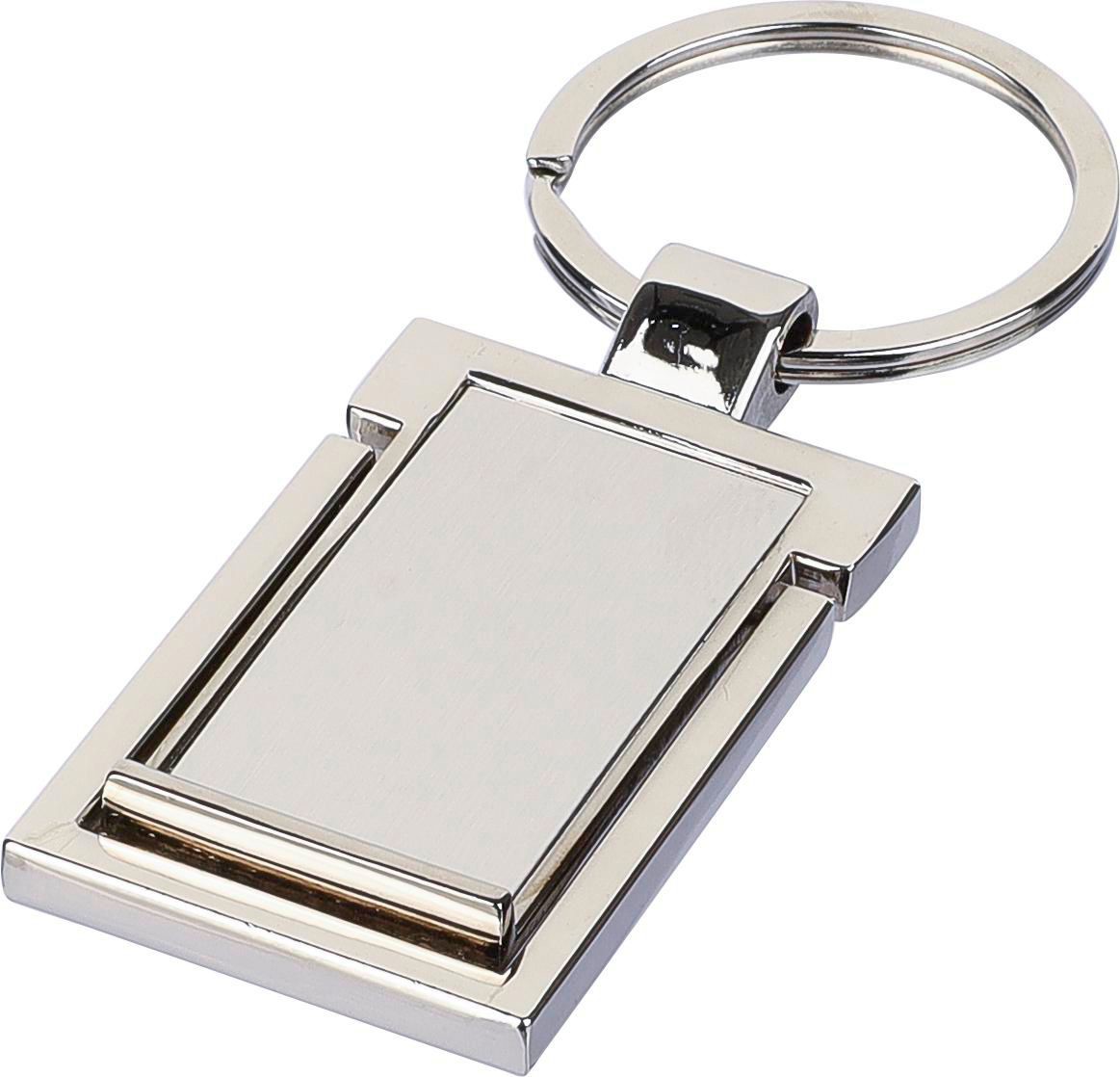 Porta-chaves em liga de zinco com argola de metal. O porta-chaves funciona como suporte para telemóvel. Apresentado individualmente em embalagem de papel castanho.