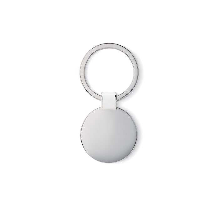Porta chaves de metal com forma redonda, acabamento niquelado brilhante.