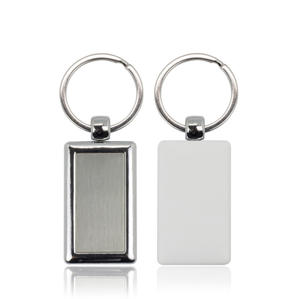 Porta-chaves retangular de plástico e metal. A face metálica brilhante e a face colorida plástica, ambas personalizáveis, em conjunto com a argola metálica, dão origem a um porta-chaves simples, mas apelativo.