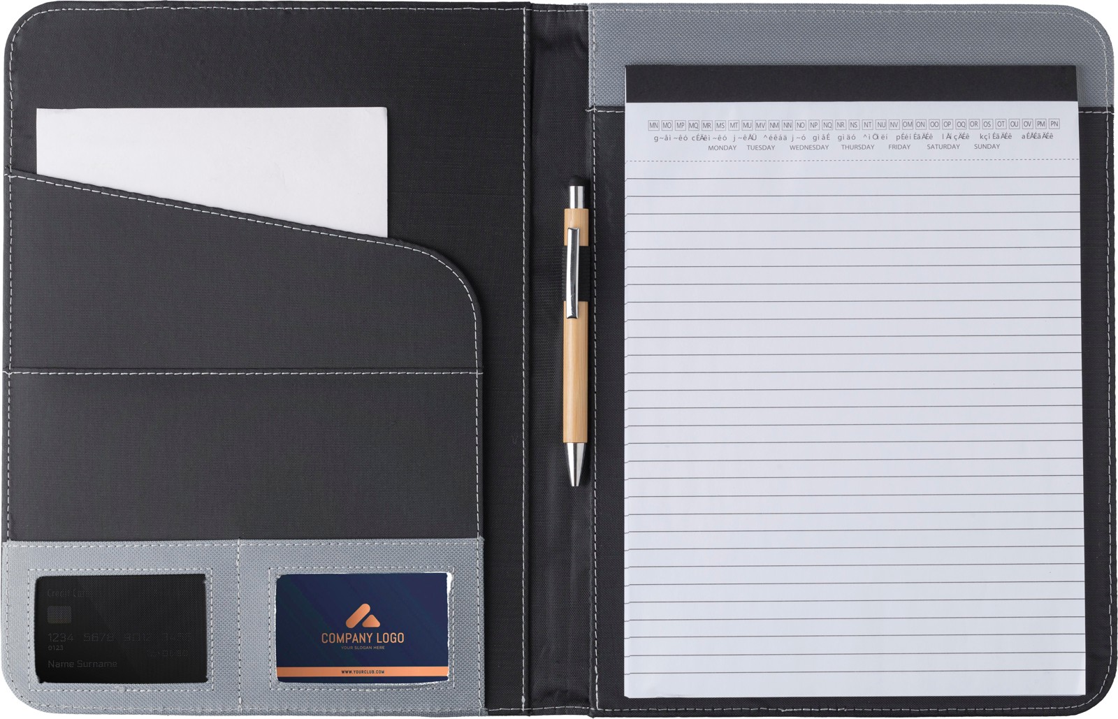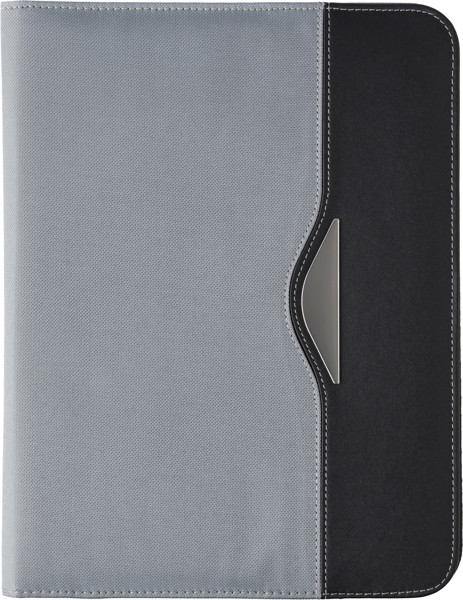 Porta documento (aprox. A4) com bloco de 20 folhas e porta-esferográficas. Fabricado com pele regenerada e poliéster 600D. Esferográfica não incluída.