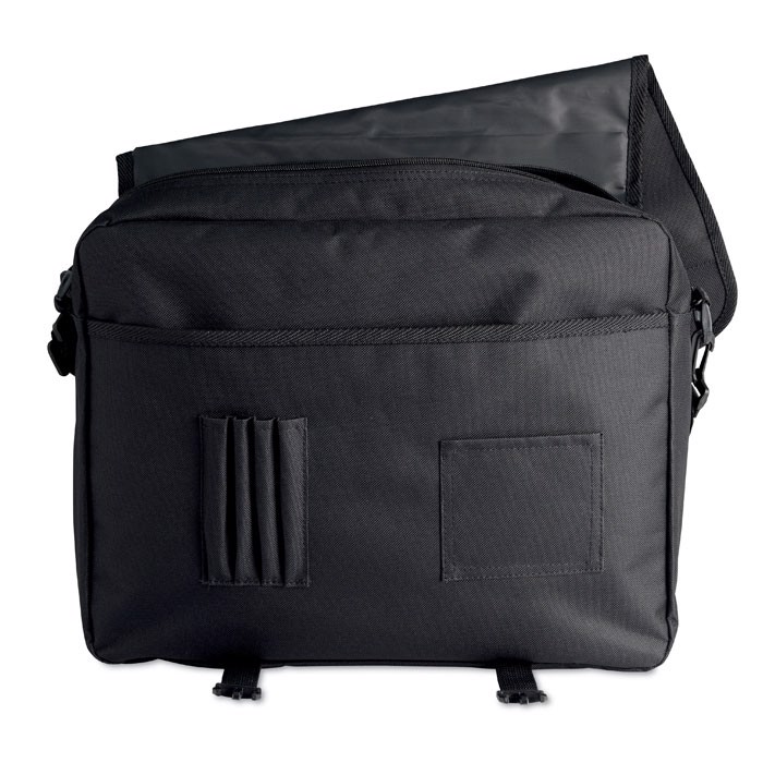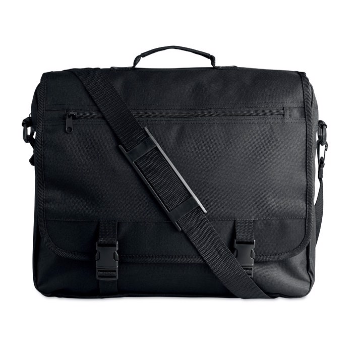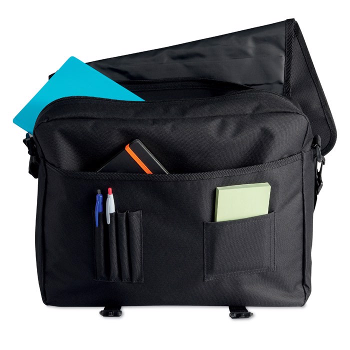 Porta documentos em poliéster 600D. Compartimento principal com fecho, bolso frontal e vários compartimentos. Aba frontal com fechos de plástico e alça ajustável e extraível.