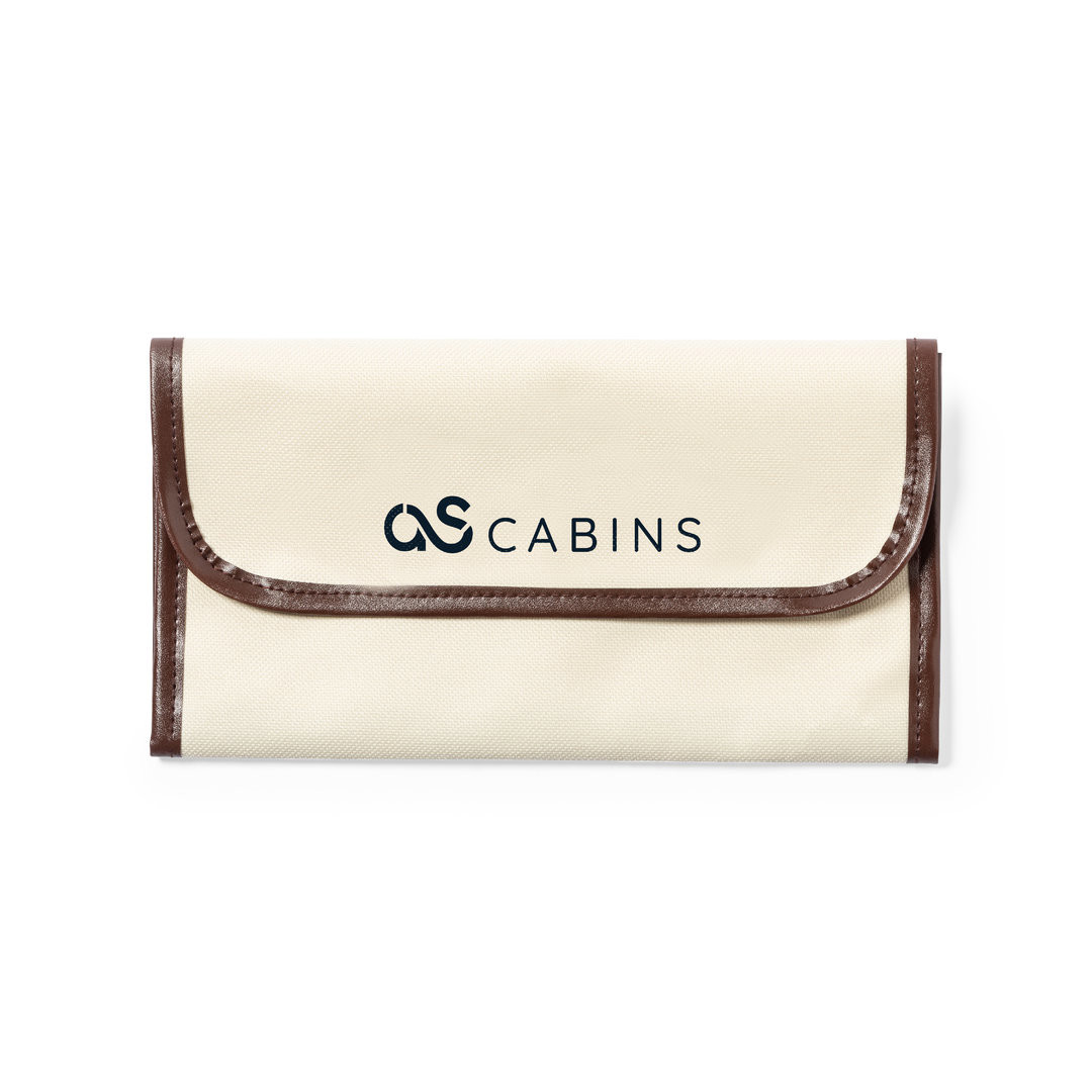 Porta-documentos de viagem fabricado em resistente 600D de acabamento natural, com costura e reforços em PU castanho. Aba com fecho de velcro e uma multitude de compartimentos interiores.