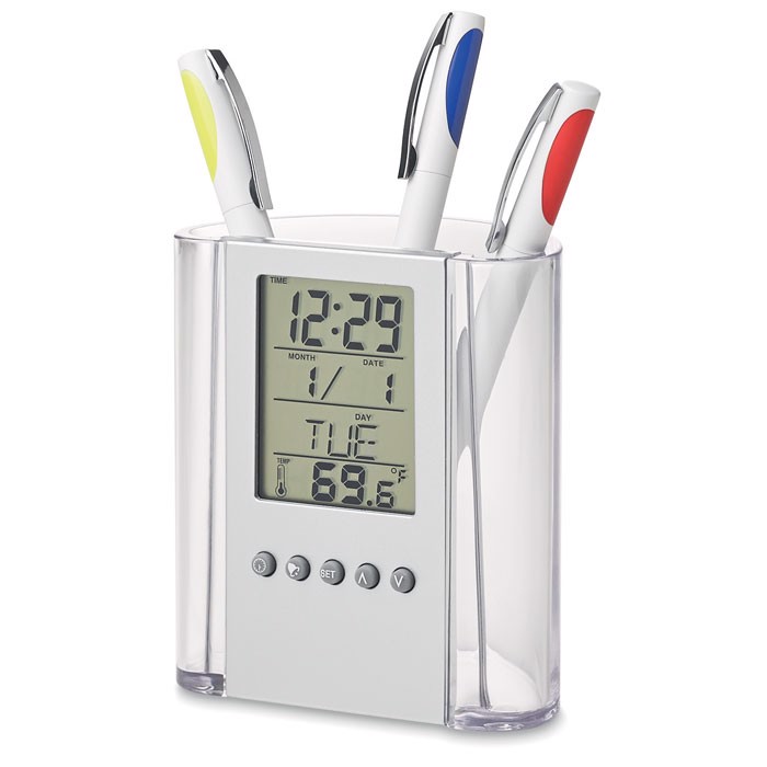 Porta esferográficas com calendário e termómetro. 1 pilha botão incluída.