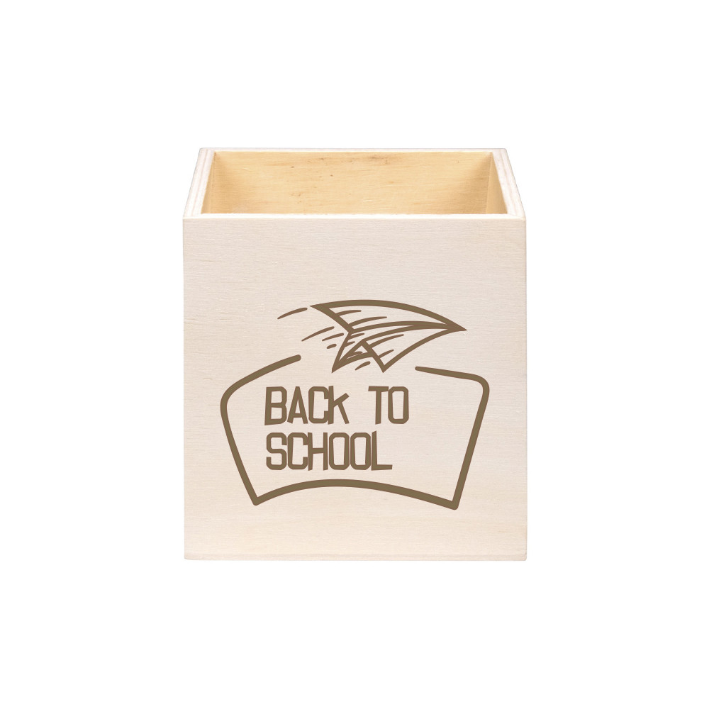 Porta-lápis multifunção fabricado em painel de madeira. Extensa zona de marcagem.