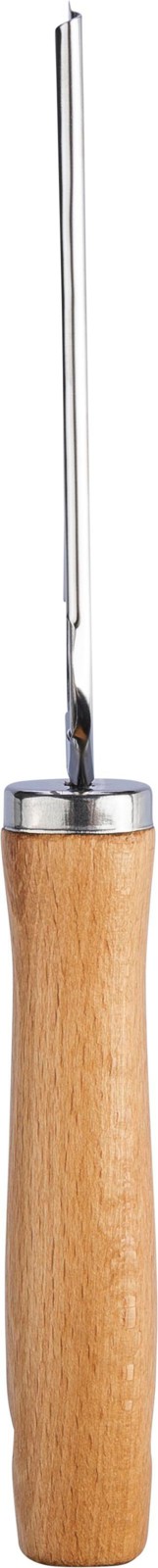 Ralador de madeira com componentes em aço inoxidável (escova de aço de qualidade 430 e suporte de aço de qualidade 410). Possui uma abertura na pega para fixação. Embalado individual com papel de seda à volta da parte metálica.