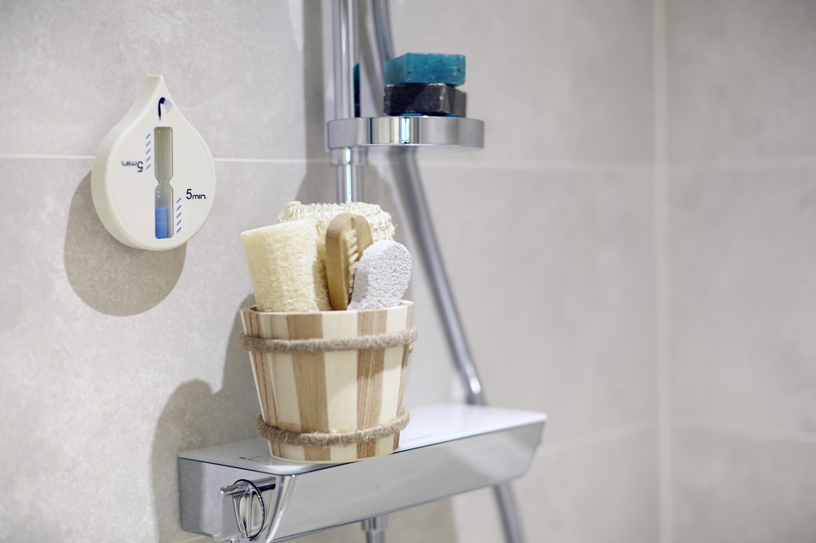 Relógio de areia em plástico. Ideal para a ducha, tem uma ventosa para fixação.(5 minutos)