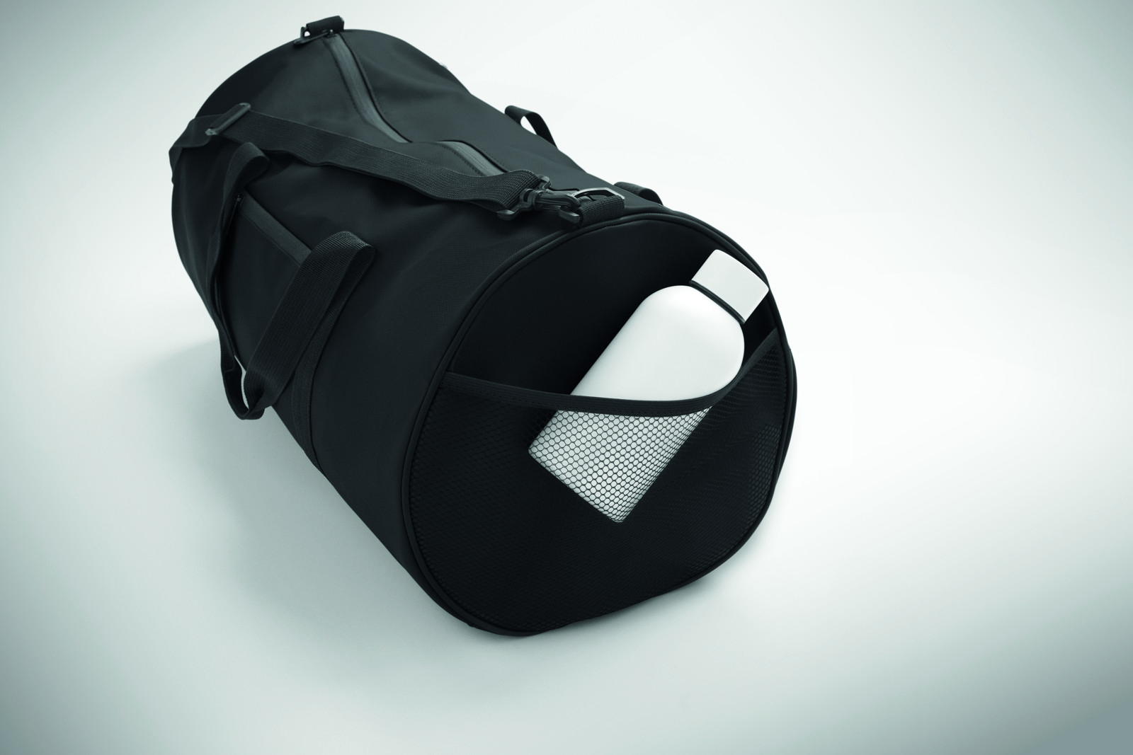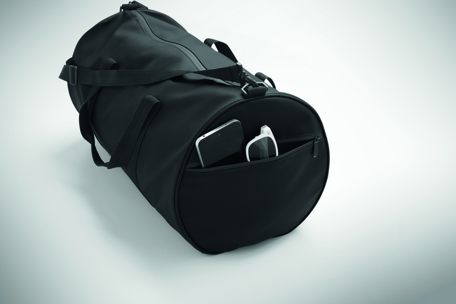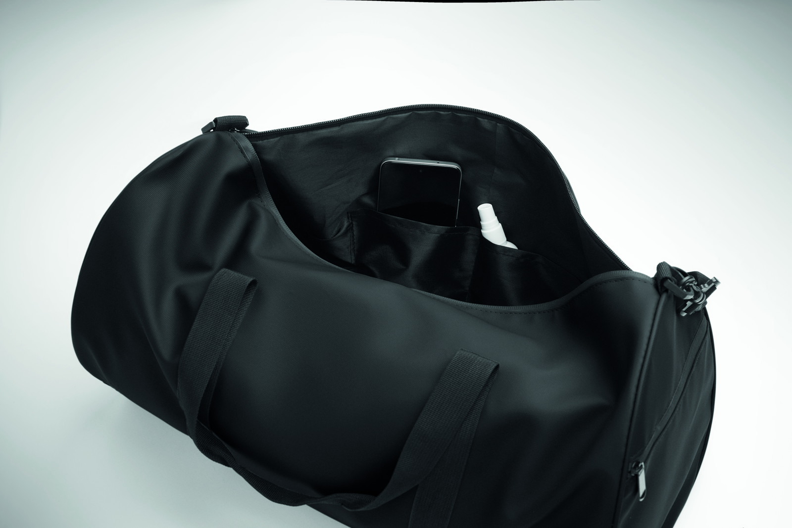 Saco de viagem em poliéster 600D RPET com revestimento em PU. Bolso frontal com fecho de correr. Forro interior em poliéster 210D RPET. 1 compartimento lateral com fecho de correr / 1 compartimento lateral com rede. Bolso interior com fecho de correr.