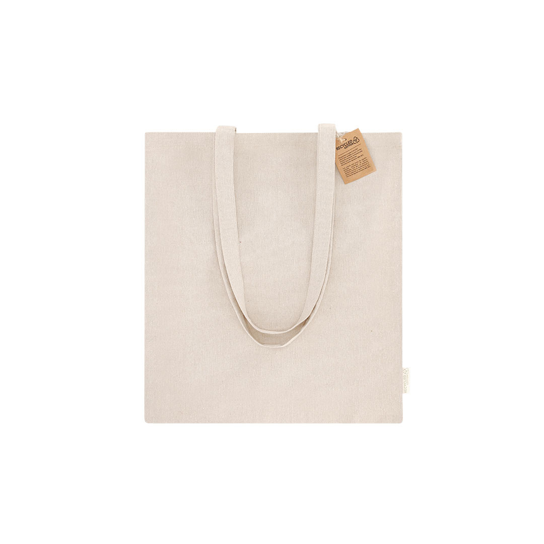 Bolsa fabricada principalmente em algodão reciclado de 260 g/m2 com sistema de fechamento superior a cordões, fabricada em rede. Alças longas de 70cm com reforço, de acabamento costurado. Logotipo na etiqueta lateral e resistência até 8 kg de peso.
