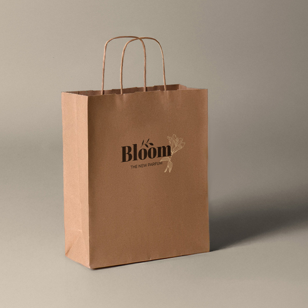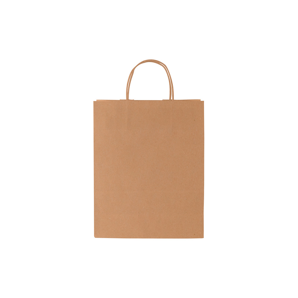 Saco de papel Kraft de 100gr/m2, alça enrolada, tamanho 25 x 30 x 11 cm.