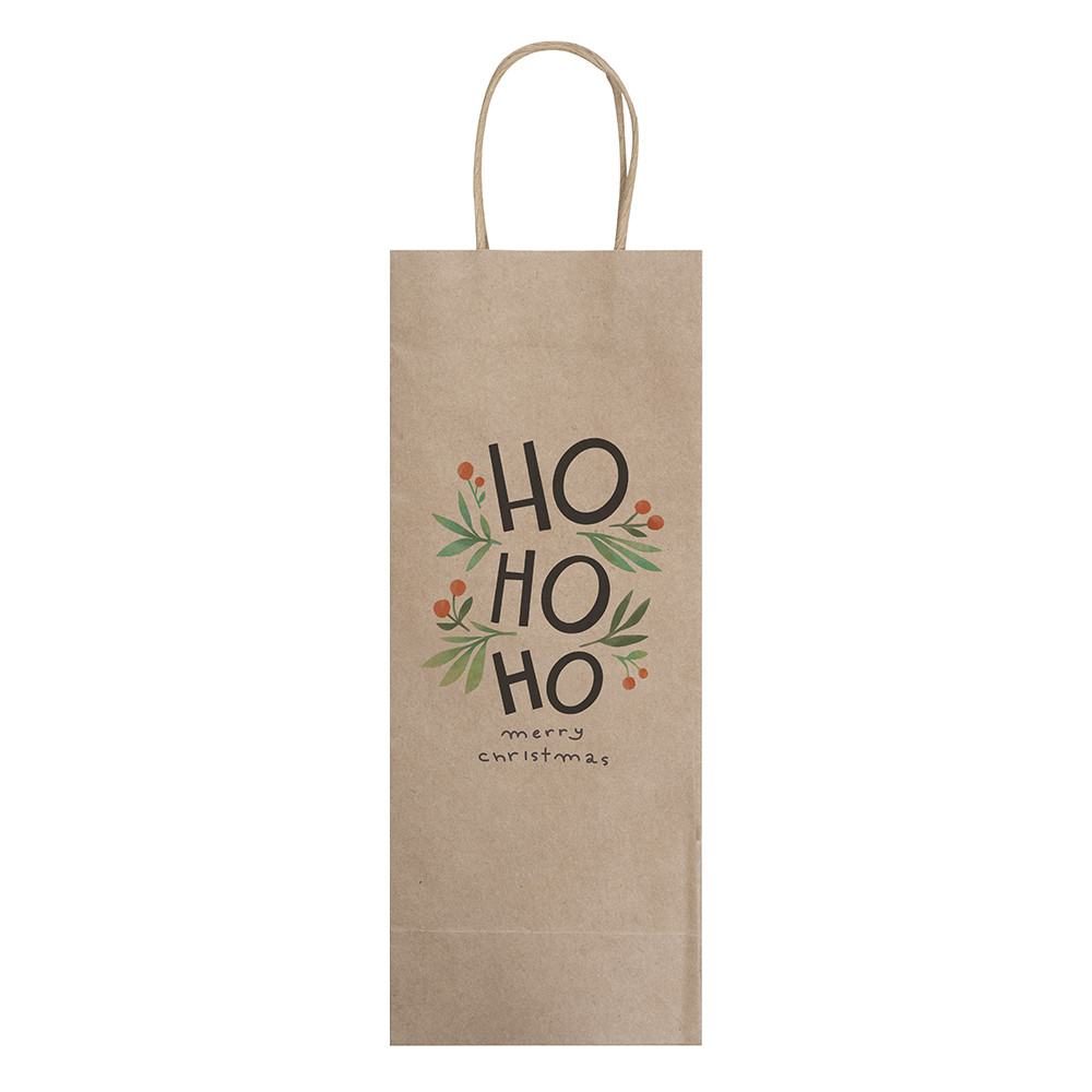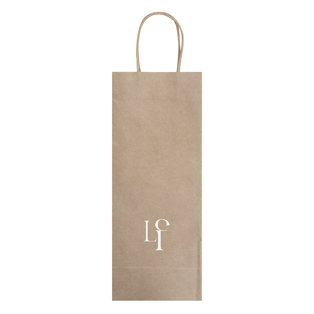 Saco de papel Kraft de 120 gr/m² com certificação FSC, asa encaracolada e com espaço para uma garrafa de vinho.