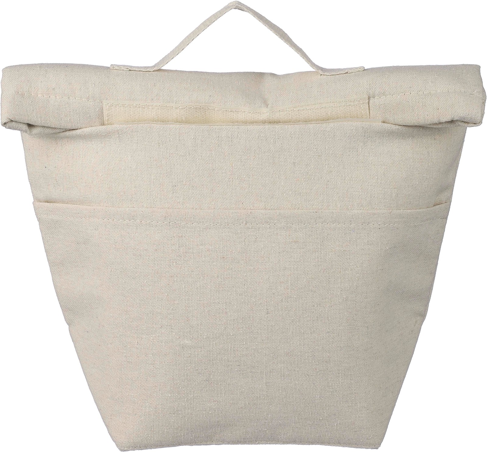 Saco térmico em algodão reciclado (220 g/m2) com tampa de rolo e revestimento interior em EPE de 3 mm e PEVA 12C. Possui fecho de velcro, um pequeno bolso frontal e uma alça de transporte curta na parte superior. Inclui etiqueta de algodão reciclado no exterior.
