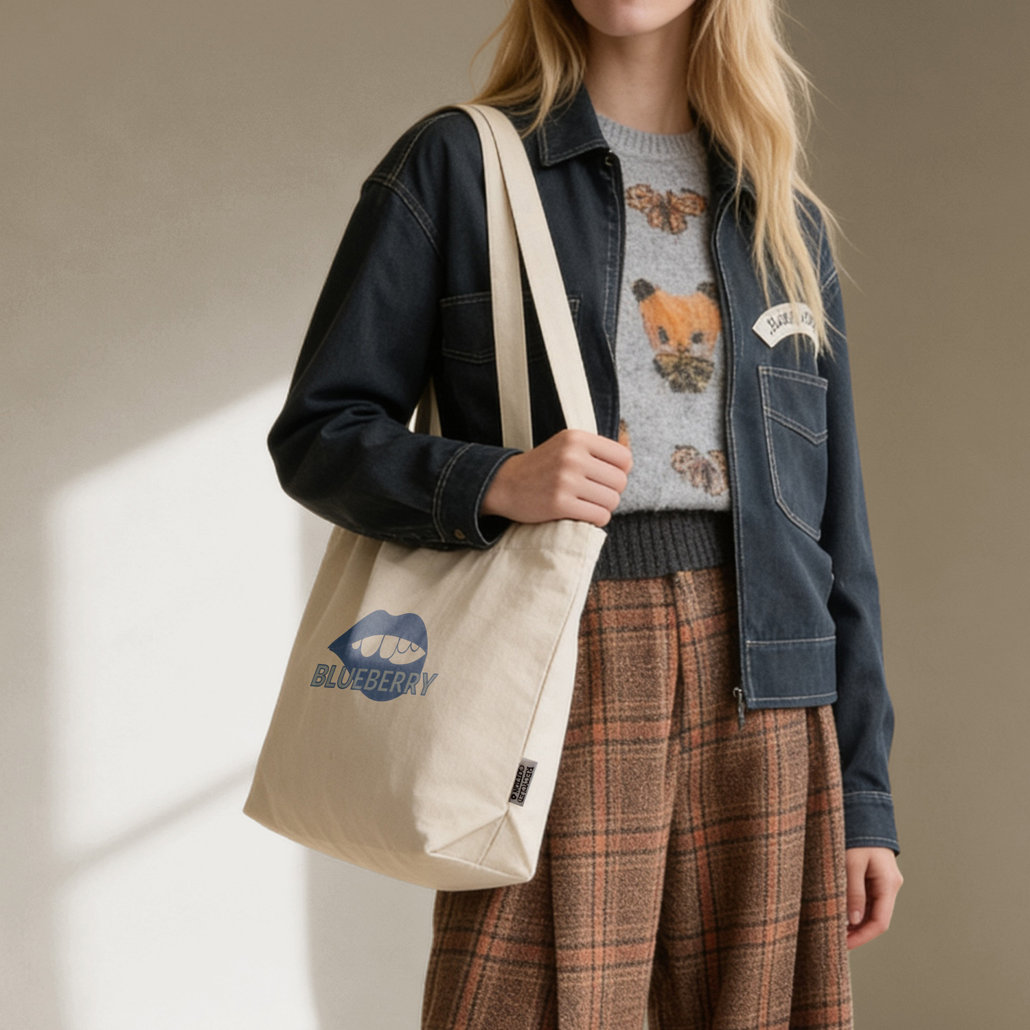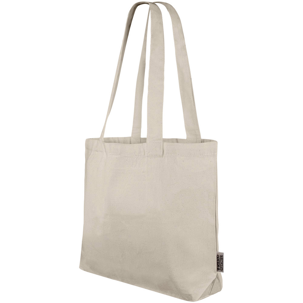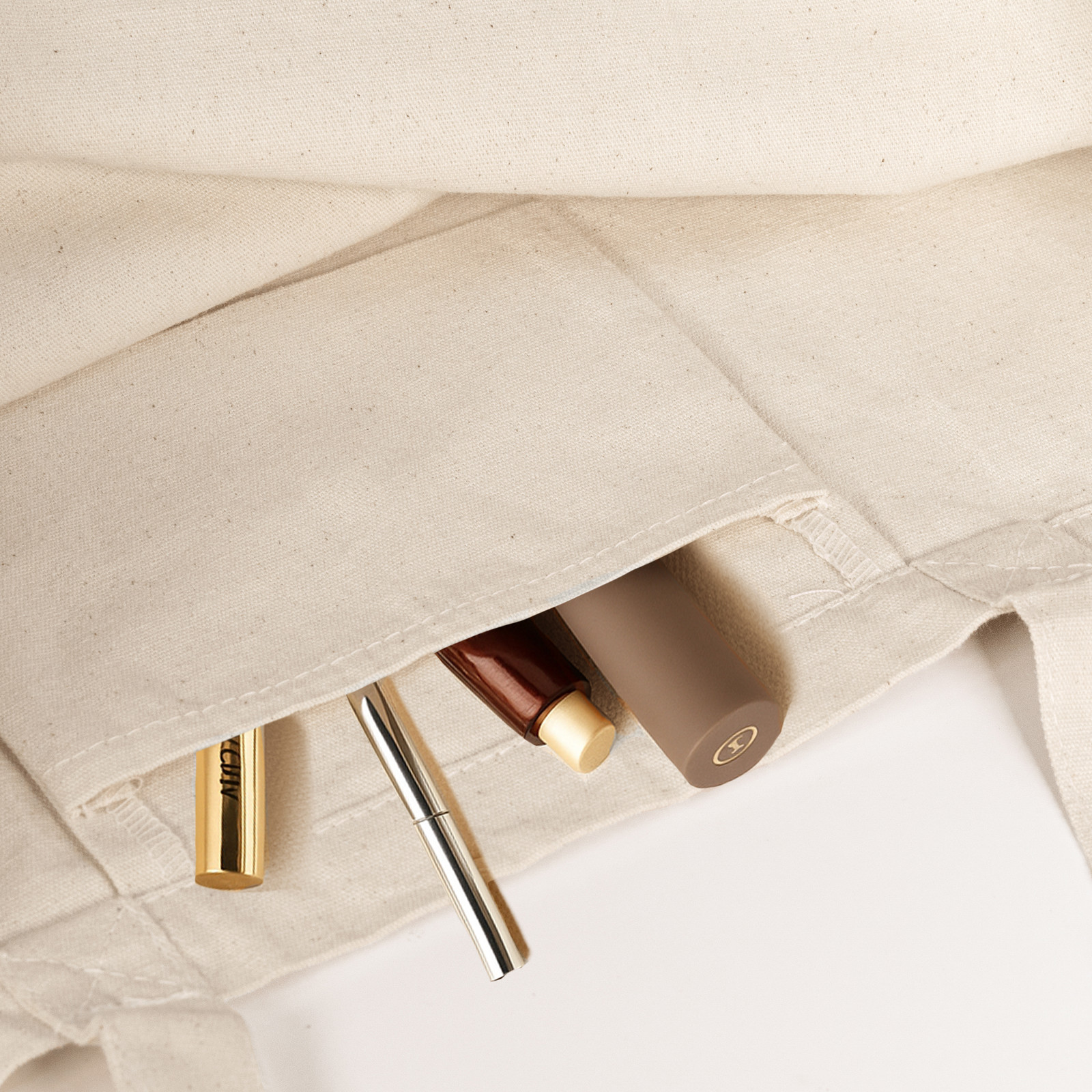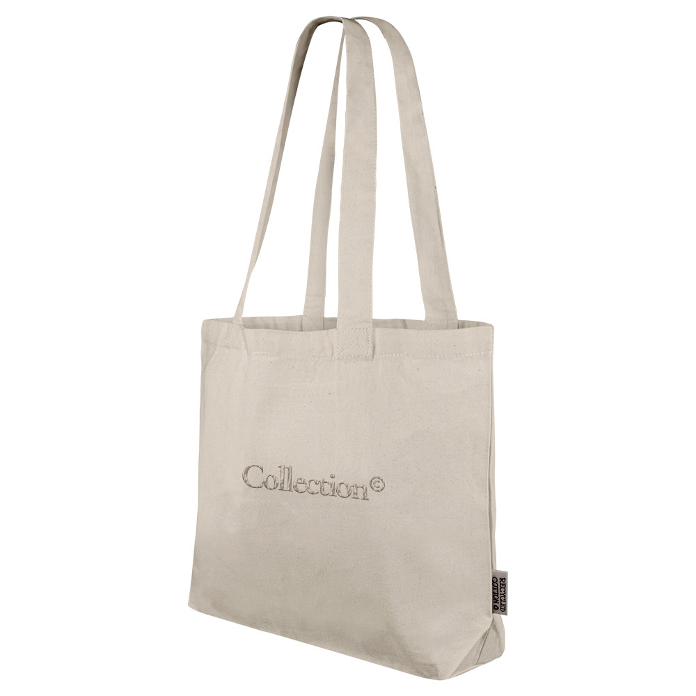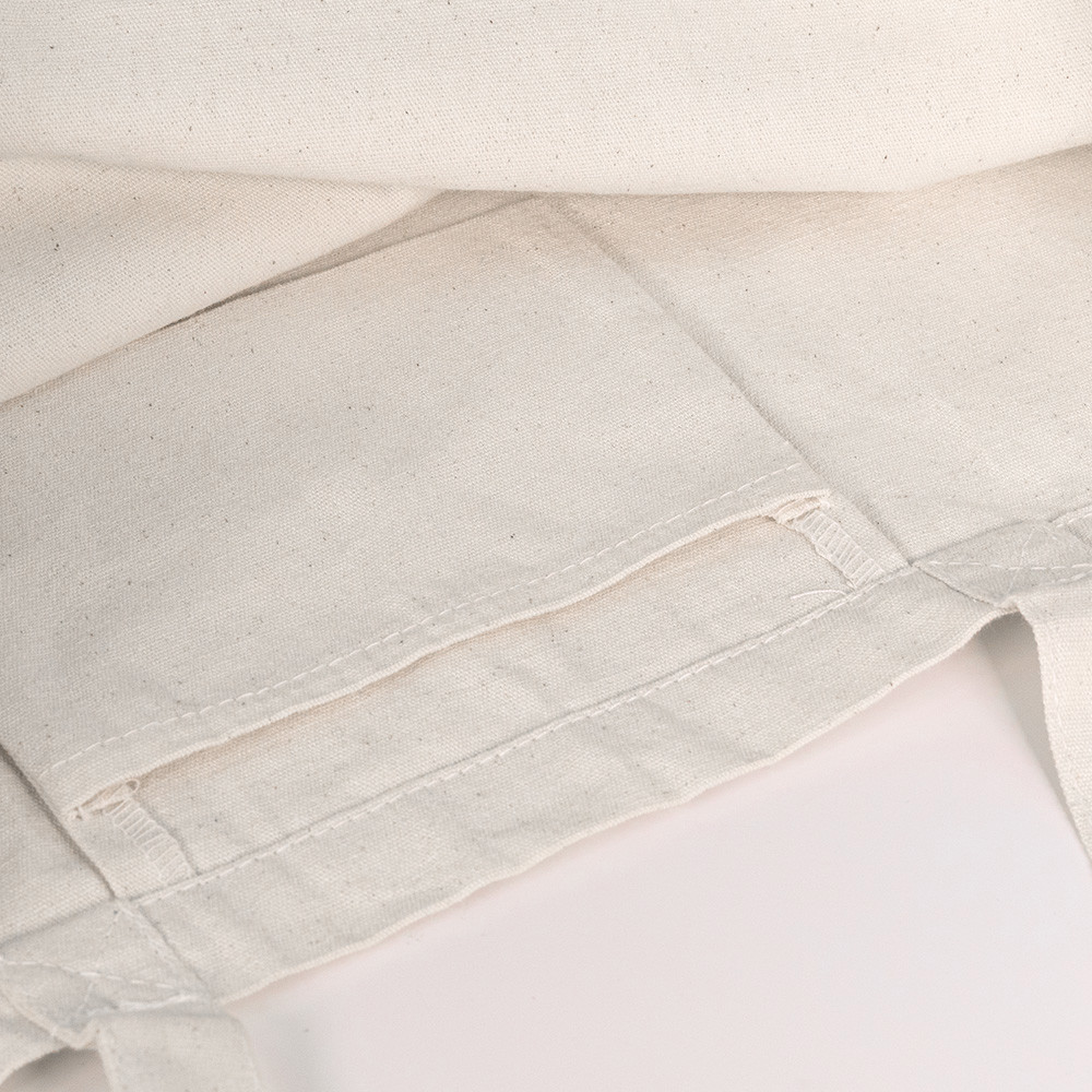 Saco 100% algodão reciclado 280 gr/m2 com alças de 65 cm de comprimento e bolso interior.