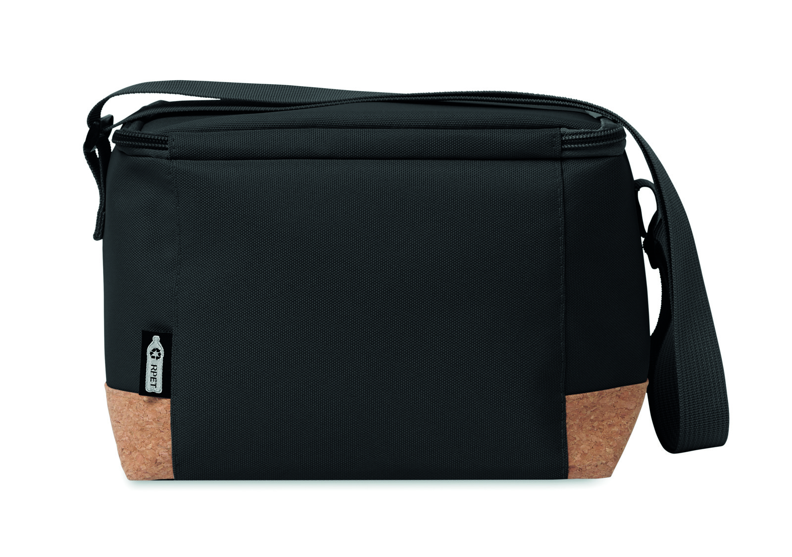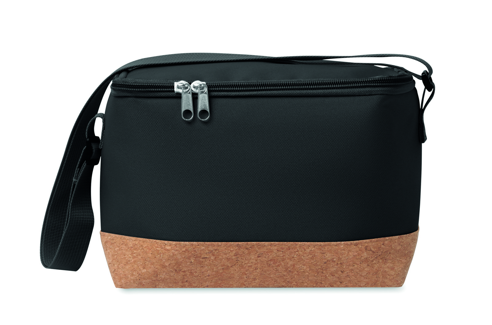 Saco térmico RPET 600D com pormenor de cortiça no fundo. PEVA com espuma PE de 2 mm. Capacidade 5L.