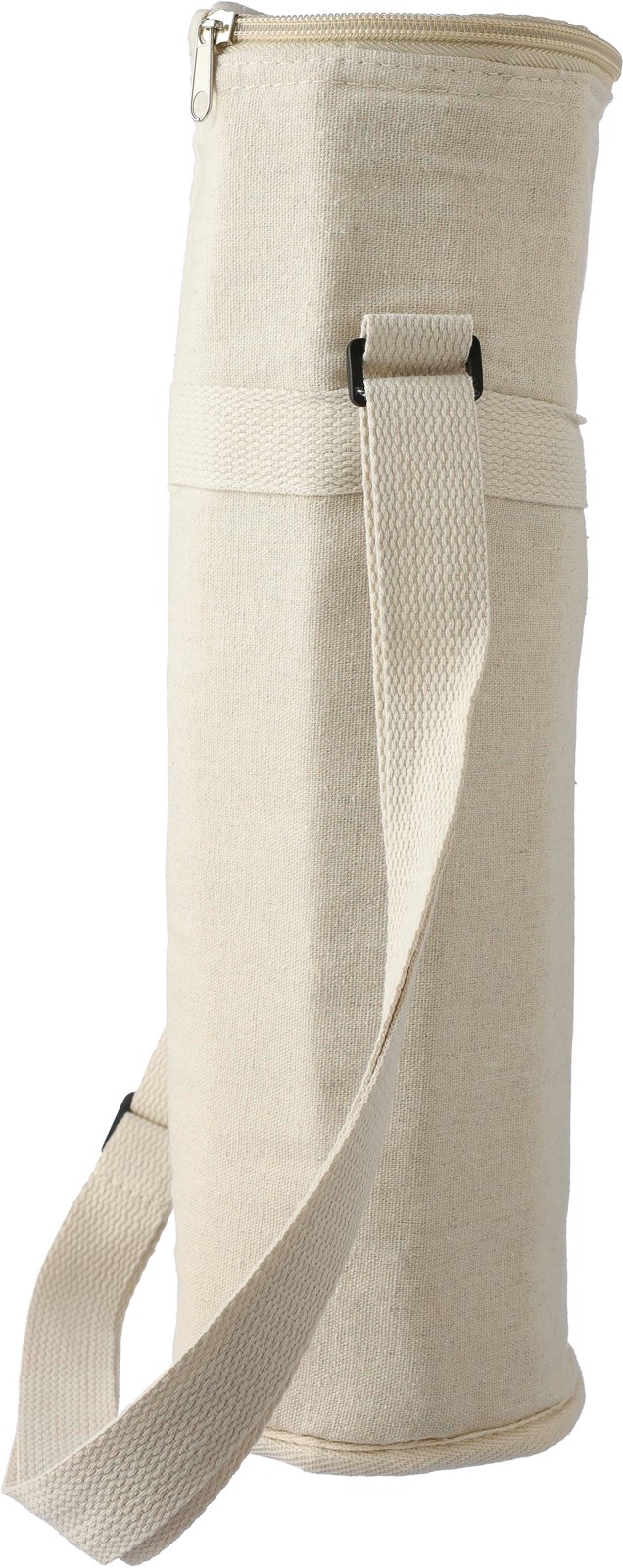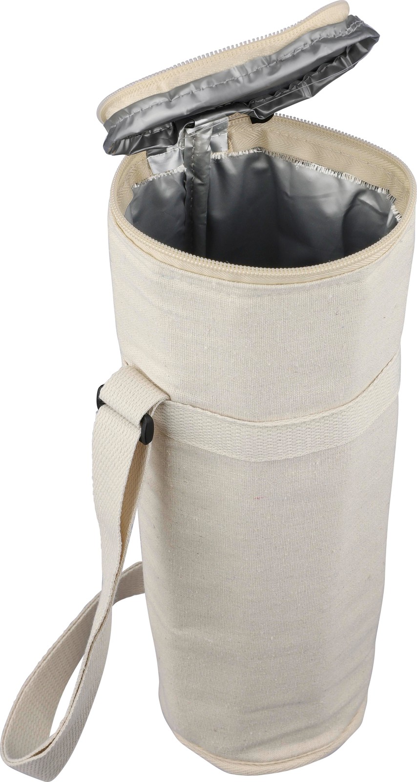Saco térmico para garrafas em algodão reciclado (270 g/m2) com revestimento interior em EPE de 2 mm e PEVA 12C. Fecho de correr. Alça de transporte longa e ajustável. Capacidade: garrafa de 1,5 litros. Inclui etiqueta de algodão reciclado no exterior.