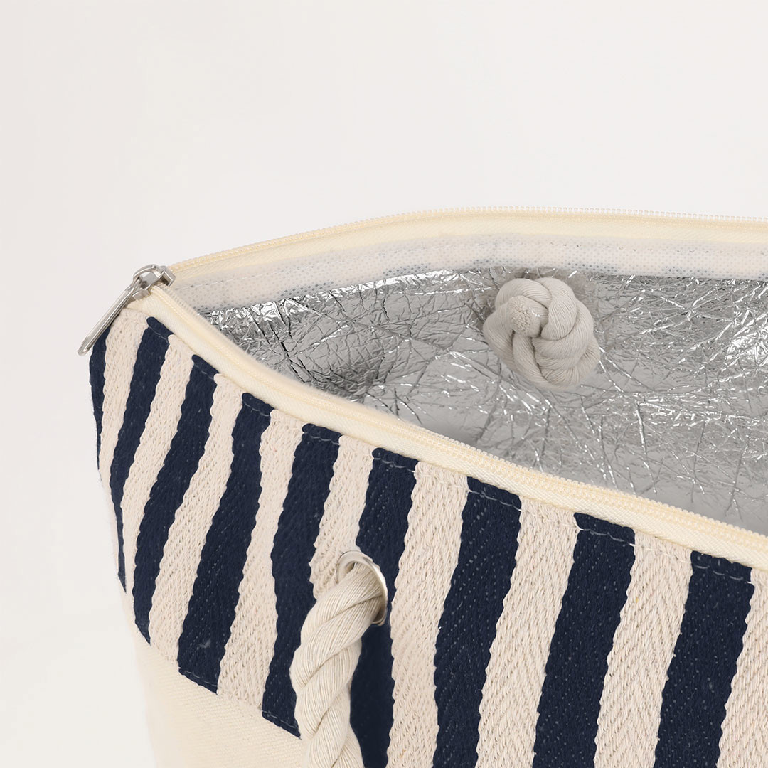 Bolsa térmica confeccionada em material RPET resistente com interior em alumínio, ideal para manter a temperatura de alimentos e bebidas.Com um design em listras naturais combinando com a cor. Inclui fechamento de zíper para maior segurança e alças longas de algodão em formato corda, reforçadas com resistentes argolas metálicas.