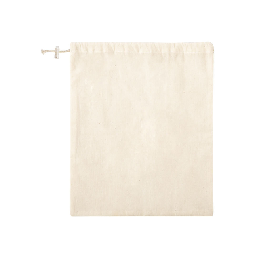 Bolsa de malha da linha da natureza em algodão de cor crua 120g/m2, com um lado plano para impressão. Fechamento de string com acessório de ajuste.