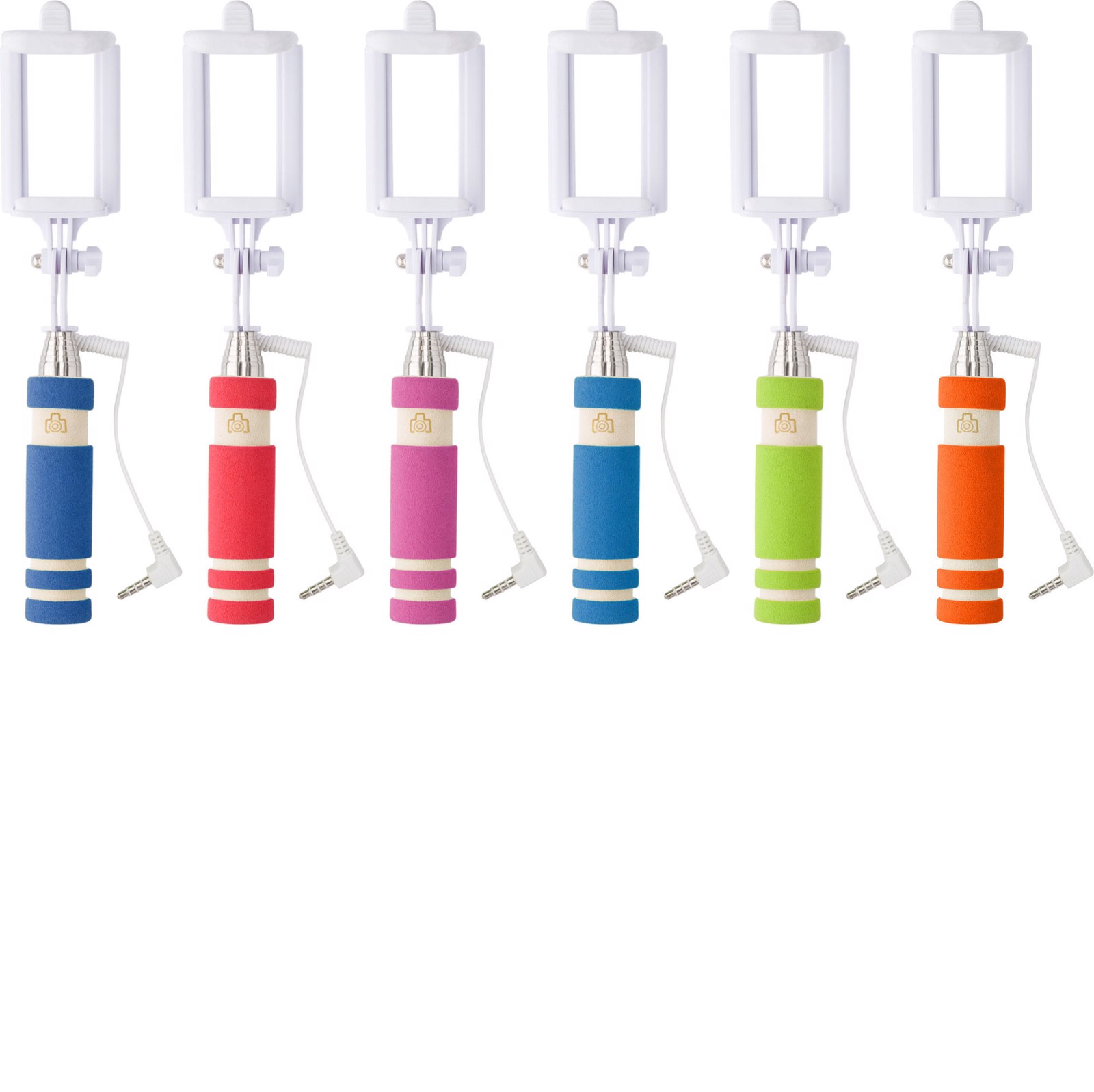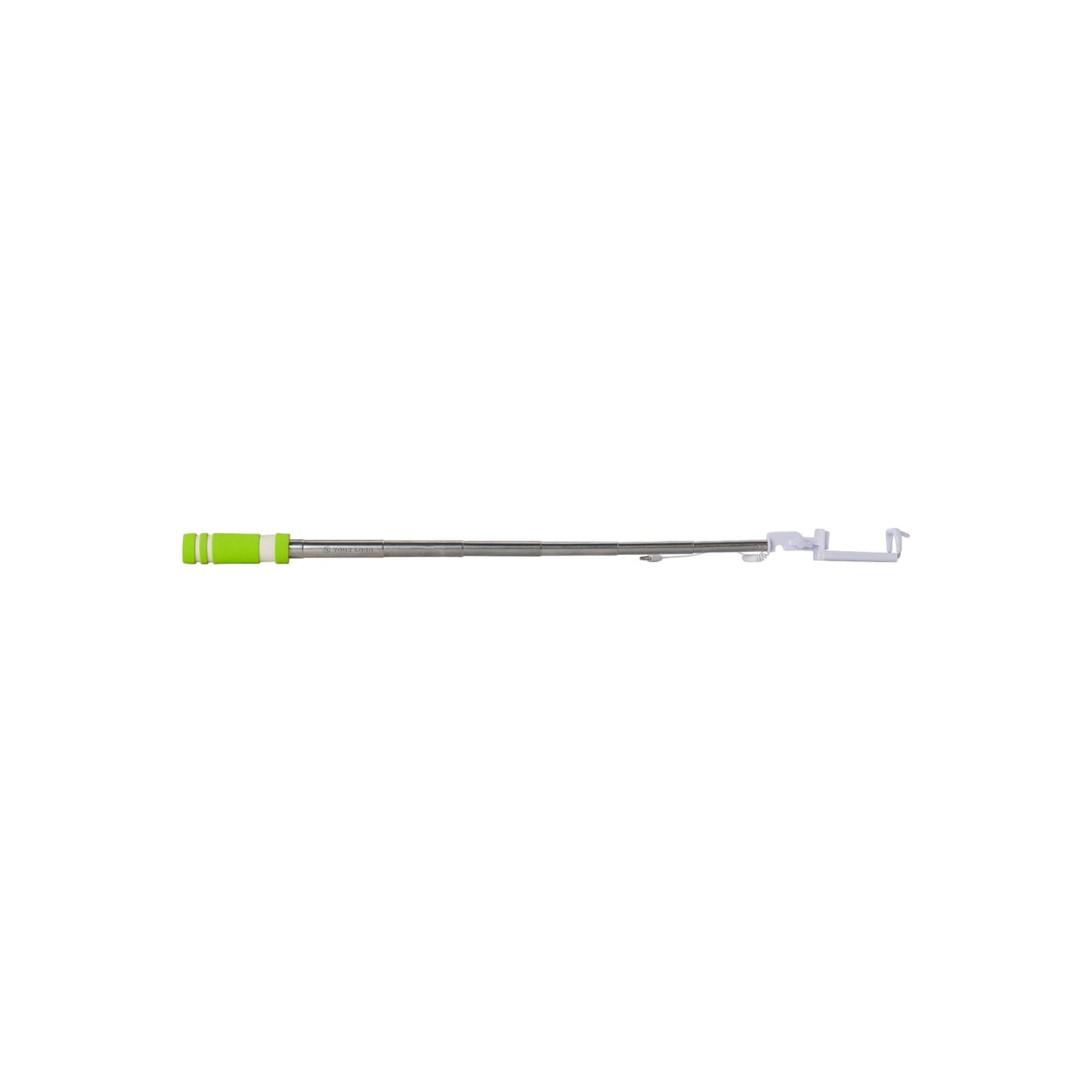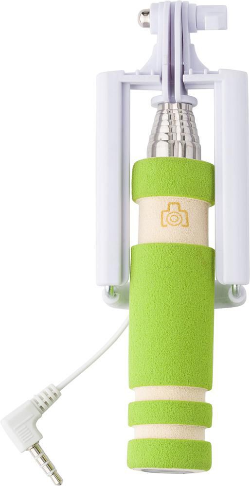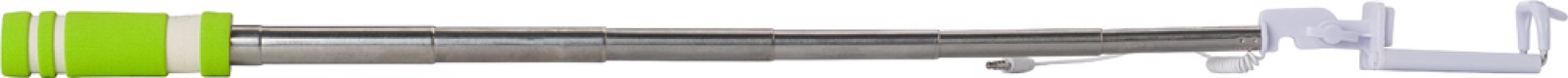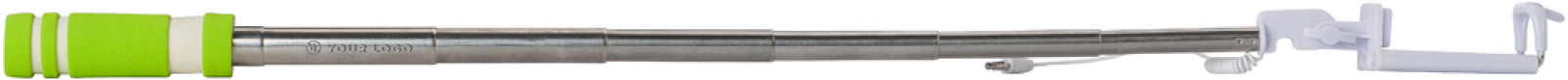 Selfie stick ABS. Extensível até um máximo de 61 cm, com um pega em espuma EVA. Inclui um botão de pressão. O suporte inclui um cabo branco com conexão, aprox. 33 cm.
