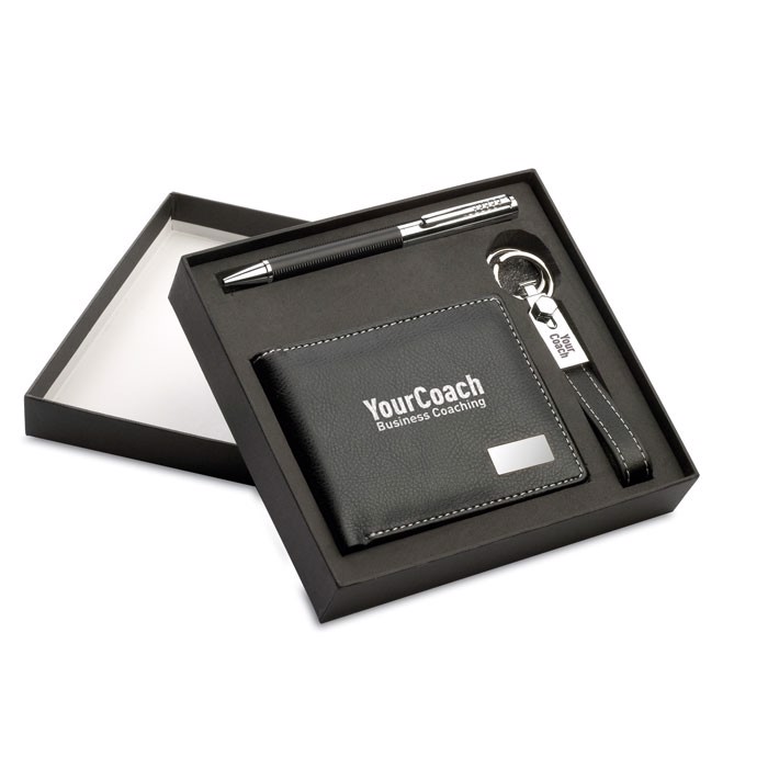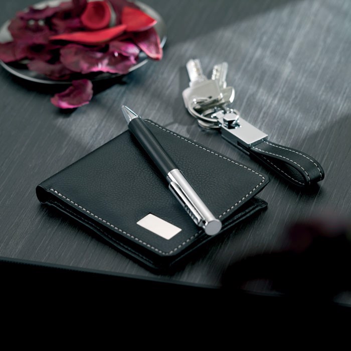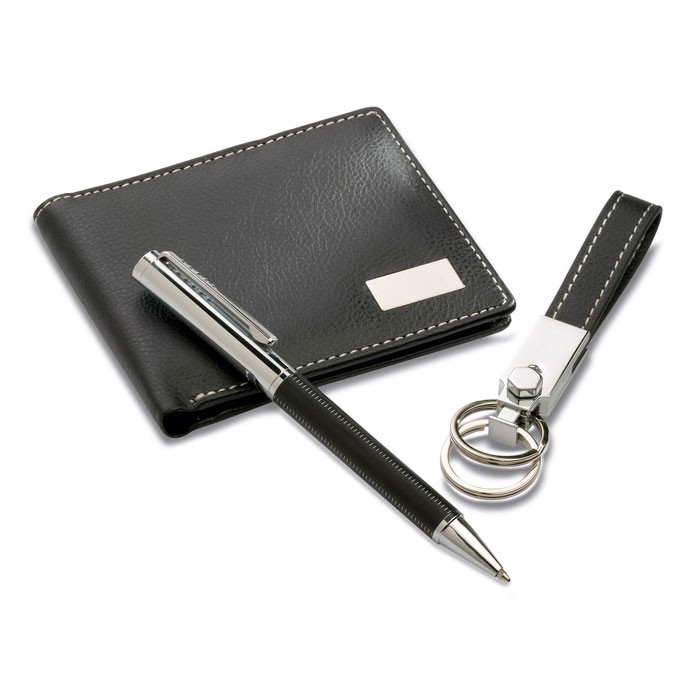 Elegante kit de presente em caixa de cartão e bandeja em EVA. Inclui esferográfica com tinta azul, porta-chaves metálico com fita de PU e carteira de PU. Todos os acabamentos do PU são em contraste.