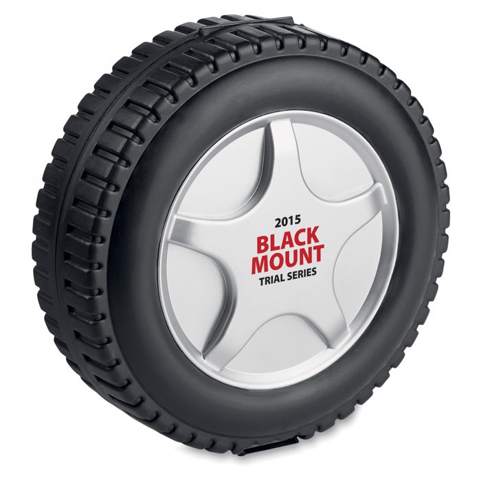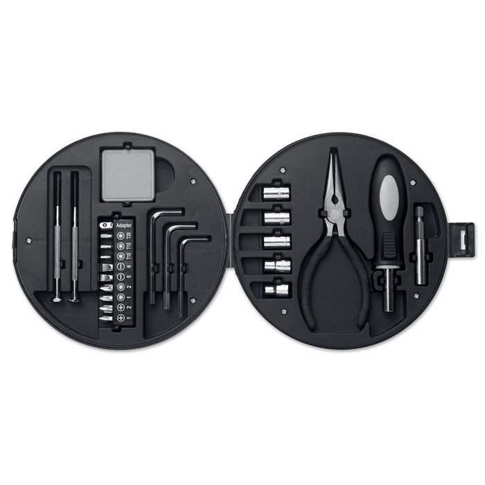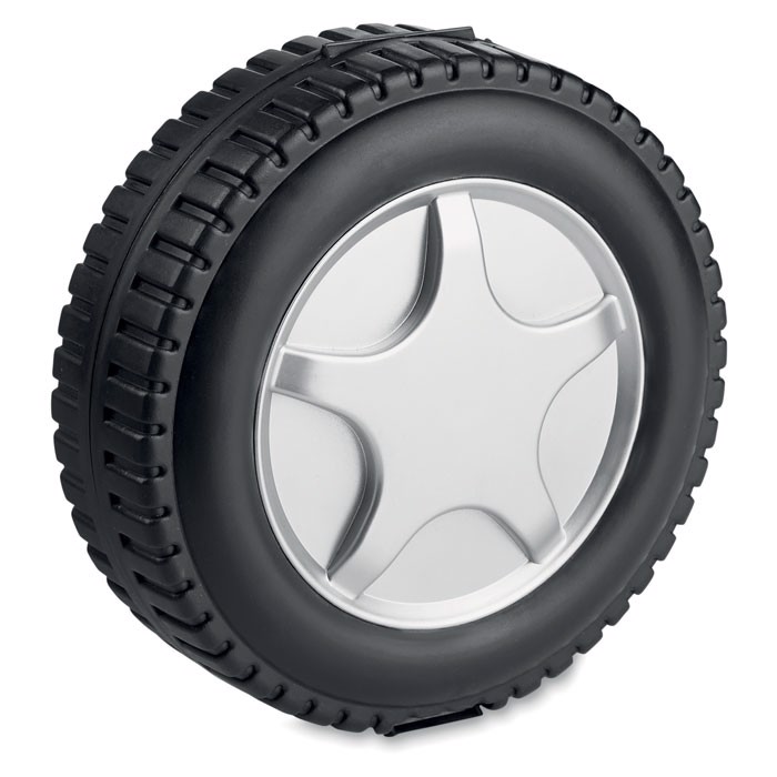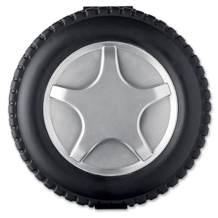 Set de ferramentas com 25 peças em caixa com desenho de pneu, inclui 1 fita métrica, 1 cabo de chave de fendas, 1 alicate, 5 casquilhos, 3 chaves sextavadas, 10 bits, 2 chaves de fenda de precisão e 1 rolo fita.