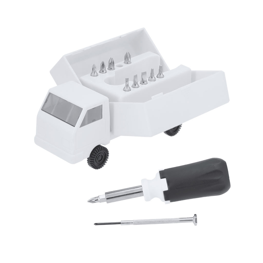 Conjunto de ferramentas com estojo em forma de caminhão. Com 15 ferramentas. Inclui conjunto de chaves de fenda de precisão (plana e philips) e cabo multifuncional com cabeçotes intercambiáveis planos e estrela. 15 Acessórios