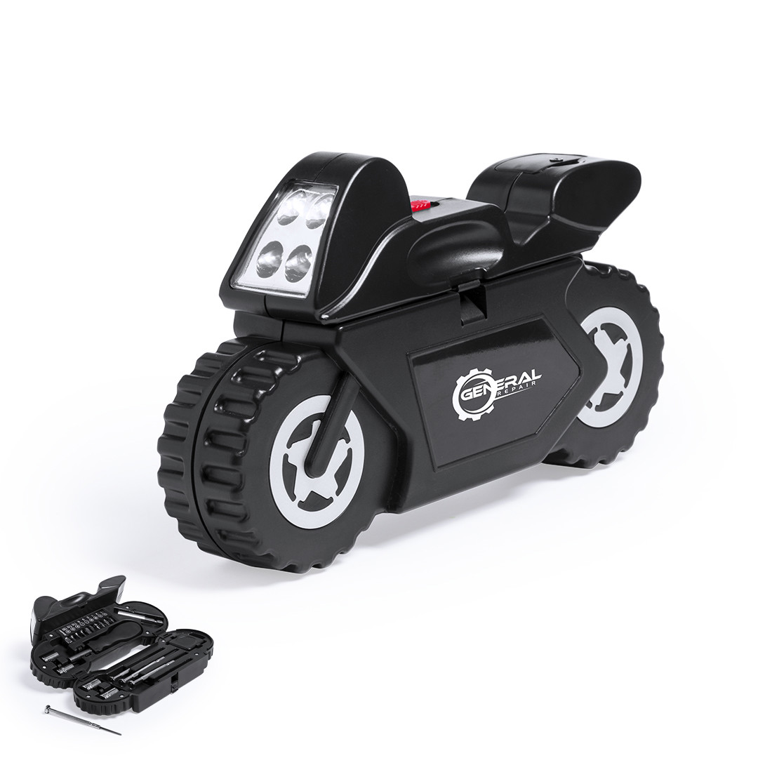 Conjunto de ferramentas de 14 acessórios em uma caixa resistente com um design de motocicleta, com lanterna 4-LED integrada. Inclui conjunto de chave de fenda de precisão, ferramenta de fixação, cabeças de chave de fenda planas e em estrela e chaves de porca de cabeça hexagonal. Pilhas de botão incluídas. Apresentado numa caixa individual. 4 Leds. 21 Acessórios. Pilhas Botão Incluídas