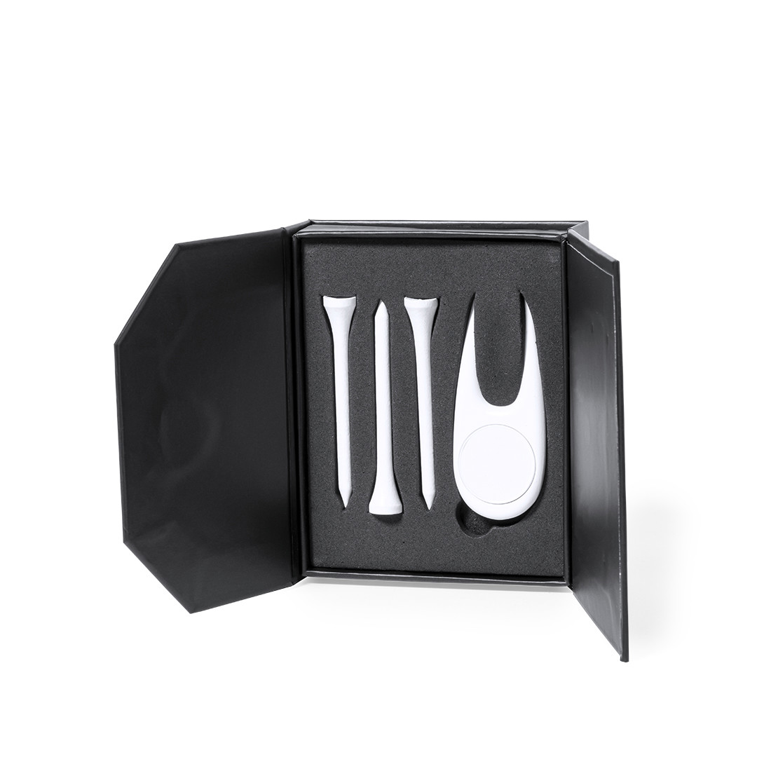 Conjunto de golfe de quatro acessórios em um elegante acabamento branco. Inclui Divot de metal com corte especial para cúpula e 3 camisetas de madeira. Apresentado em um caso individual sóbrio com corte de corte interno e fechamento do ímã. 4 Acessórios