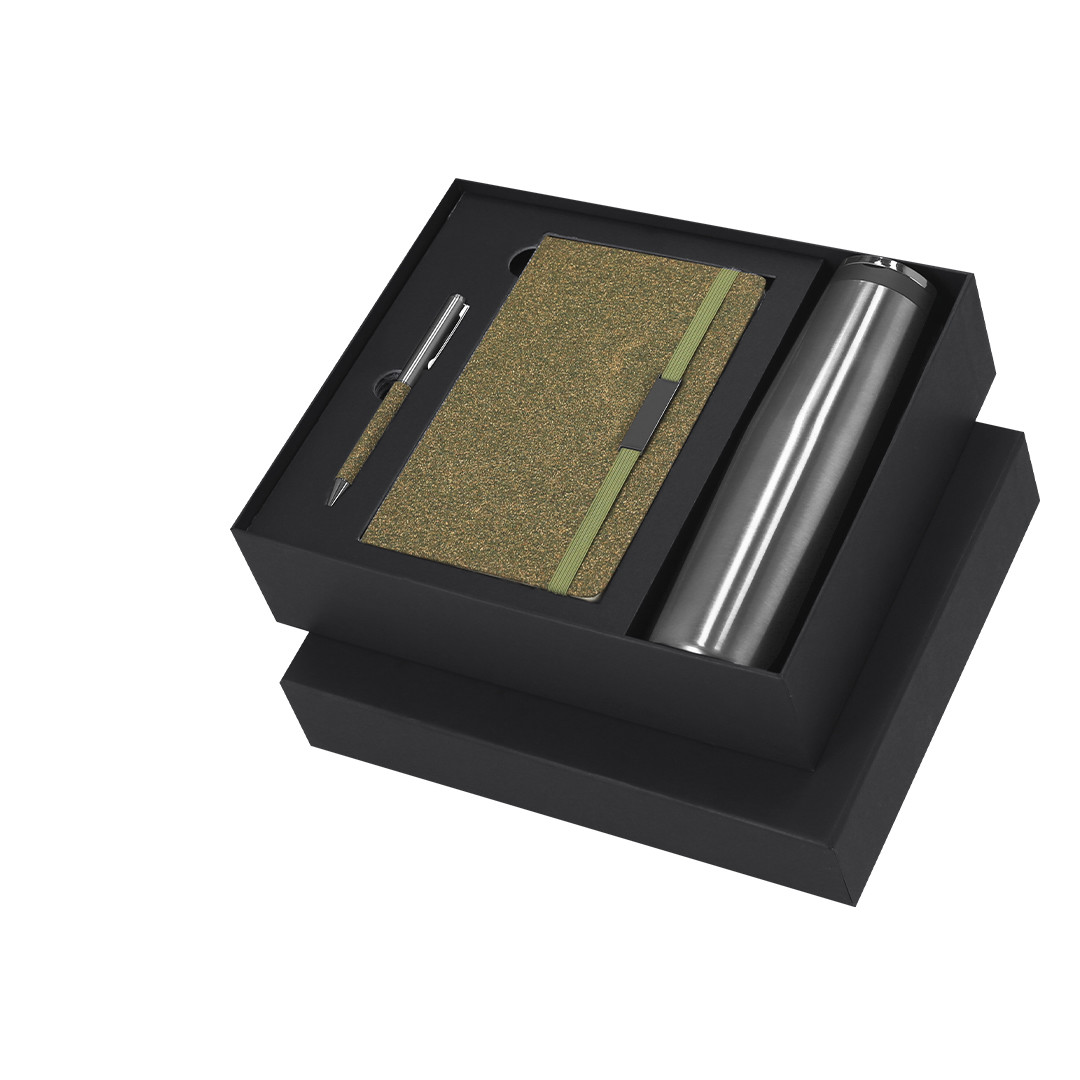Conjunto de bloco de notas e caneta confeccionados com Fibra de Chá, além de um garrafa térmica fabricada em aço inox.O conjunto inclui:- Bloco de notas de capas rígidas, com 80 páginas de linha, banda elástica com clip de metal e marca-páginas à combinação. - Caneta de alumínio com acabamento cromado com empunhadura de Fibra de Chá, mecanismo giratório e tinta azul. - Garrafa térmica de dupla parede fabricada em aço inox de 500ml. Com tampa de rosca e alça metálica. Bloco com logo Tea Grounds marcado na parte traseira. Apresentado de maneira elegante em uma caixa preta com interior recortado. Tea Grounds é um material sustentável criado a partir de resíduos de folhas de chá recicladas. Durante o processamento do chá, os restos são coletados e compactados para dar uma segunda vida como recurso útil. Sua produção fomenta a economia circular e reduz o impacto ambiental. Garrafa Térmica Aço Inox, 500 ml. Bloco Fibra de Chá, Capa Rígida. 80 Folhas. Esferográfica Fibra de Chá