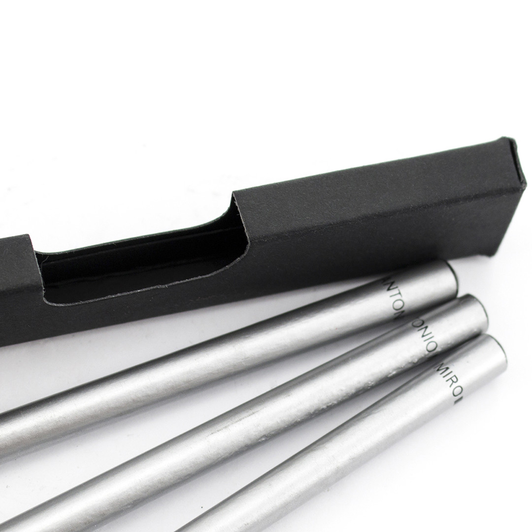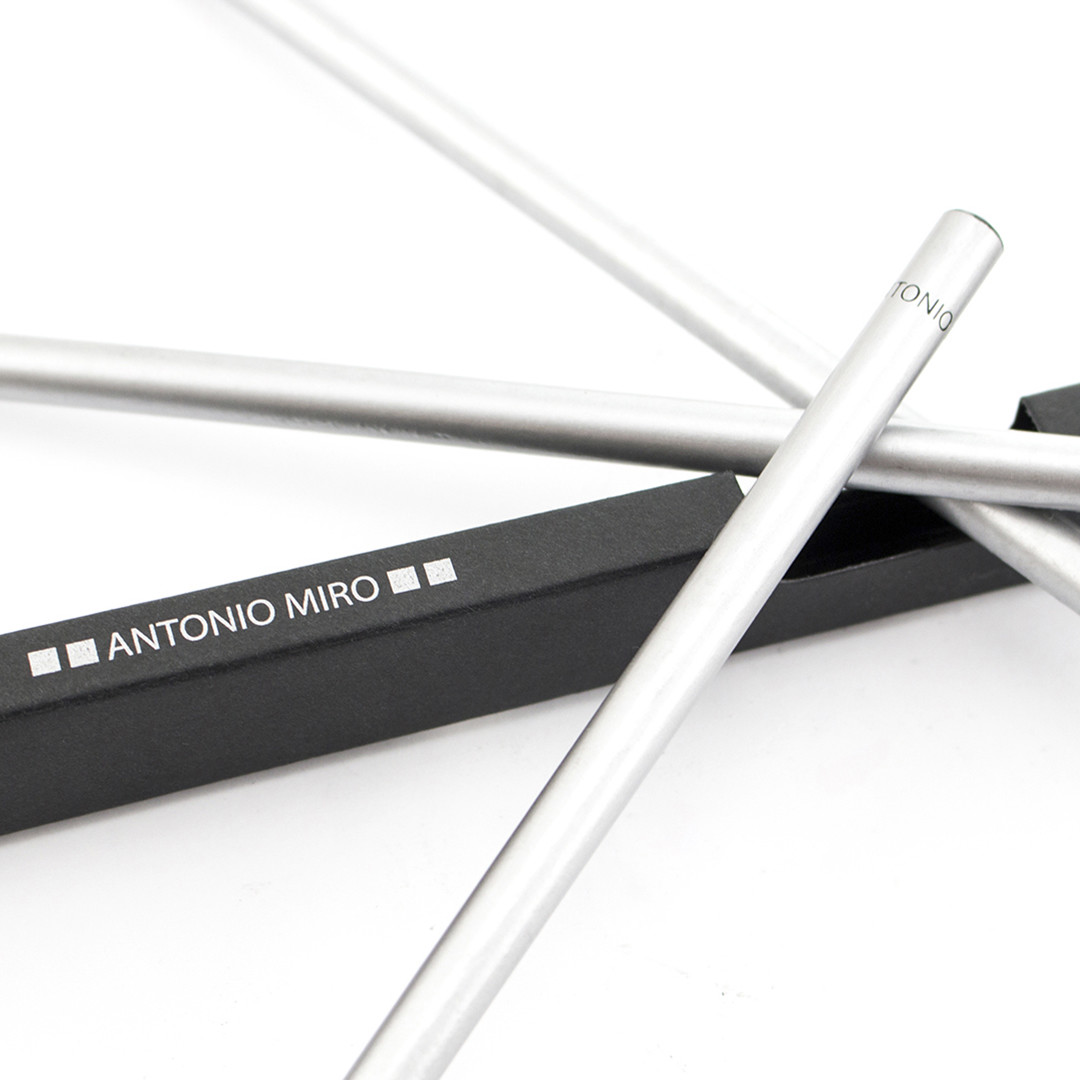 Conjunto de 3 lápis de madeira de Antonio Miró em elegante acabamento prateado, com logótipo da marca no topo. Apresentado numa elegante caixa de cartão preta com janela e logótipo da marca. 3 Lapiseiras