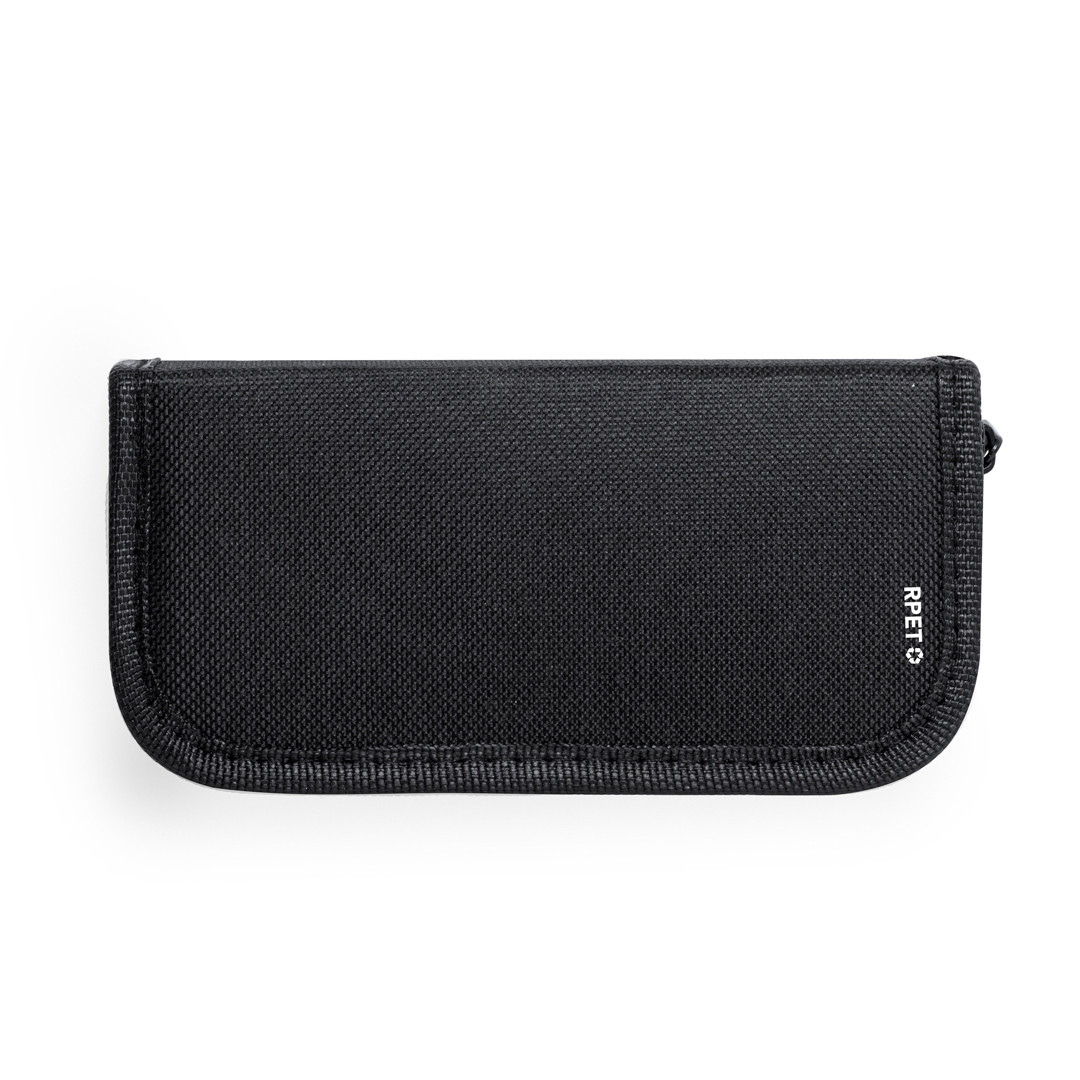Prático set de limpeza de calçado num estojo RPET. Com duas escovas de cerdas macias, calçadeira, lata de cera e pano para polir sapatos. Apresentado num prático estojo com fecho de correr e suportes elásticos para manter todas as ferramentas organizadas. Com logotipo RPET na caixa. O material RPET é elaborado a partir de plástico reciclado, para assim promover a reutilização de resíduos plásticos e ajudando a sustentabilidade do planeta. 5 Acessórios. Bolsa Poliéster RPET