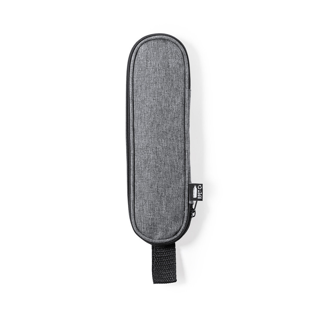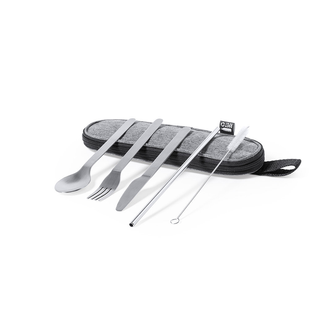 Conjunto de talheres reutilizáveis fabricados em resistente e duradouro aço inox. Inclui colher, faca, garfo, palhinha e acessório de limpeza. Apresentados em elegante estojo individual de poliéster 300D RPET, elaborado a partir de plástico reciclado para promover a reutilização de resíduos plásticos e contribuir para a sustentabilidade do planeta. Estojo com fita de transporte, fecho de correr e distintivo RPET na etiqueta. 5 Peças. Bolsa Poliéster RPET