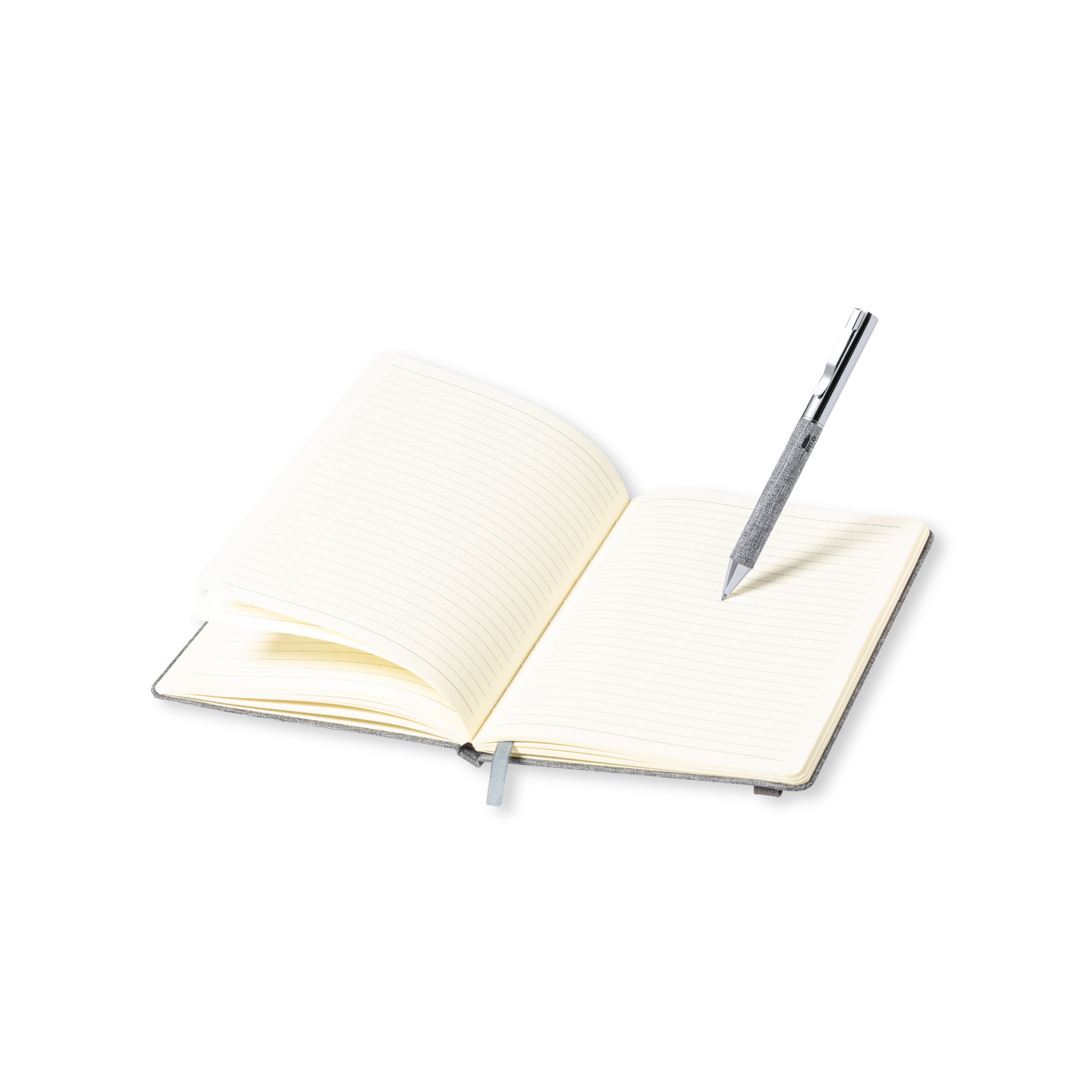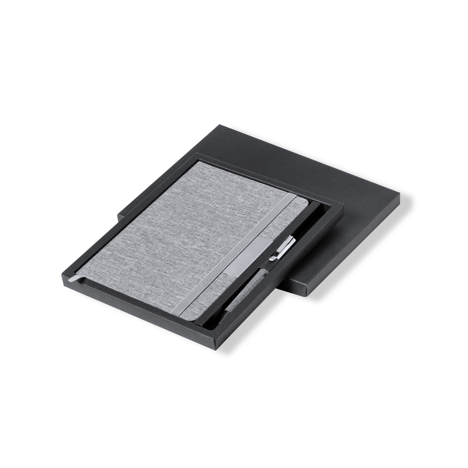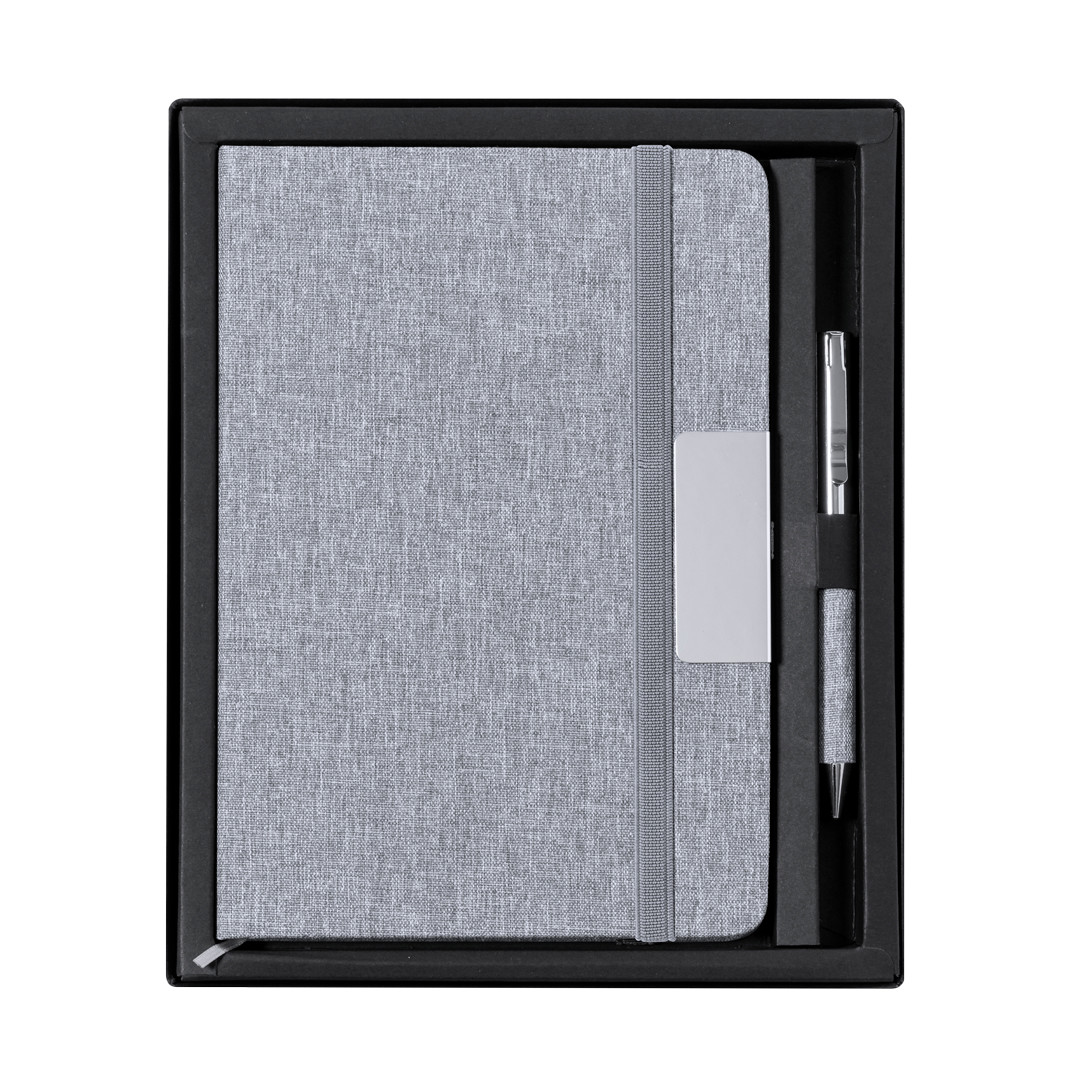 Conjunto de bloco de notas e esferográfica em RPET, elaborado a partir de plástico reciclado para assim fomentar a reutilização de resíduos plásticos e ajudar na sustentabilidade do planeta. Inclui: Bloco de notas de capas rígidas, com detalhe metálico na capa, marca páginas de tecido e fita elástica a condizer. 100 folhas interiores com disposição pautada e distintivo RPET.Esferográfica fabricada em metal cromado e com corpo revestido em poliéster RPET. Elegante clip metálico e acessórios a condizer, de mecanismo giratório e com tinta azul. Com distintivo RPET no corpo.Conjunto apresentado em elegante estojo de design em cor preto, com compartimento independente para bloco de notas e esferográfica. Bloco de Notas Capa Rígida. 100 Folhas. Esferográfica Incluída