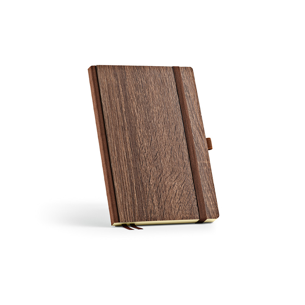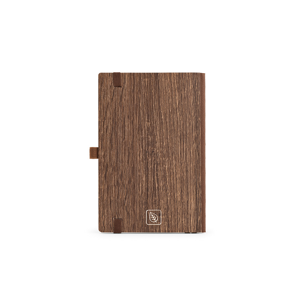 Caderno Steinbeck A5, com uma capa distinta com textura de madeira. Contém 196 páginas lisas FSC® (70 gsm), com espaço para data e numeração, lombada em rPET, bolso interior na contracapa, fita dupla e suporte para esferográfica integrado na lombada - uma opção elegante e funcional. Fornecido numa manga individual de kraft.