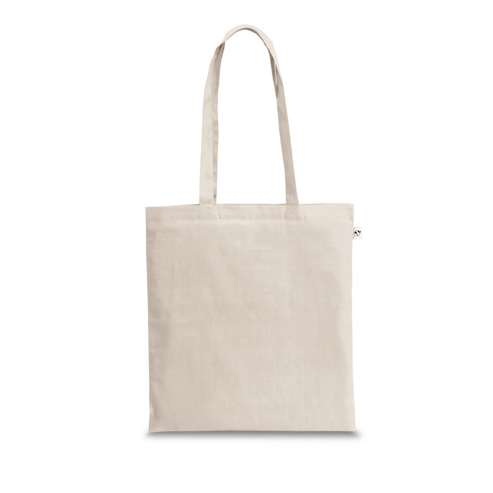 Saco em algodão reciclado (70%) e poliéster (30% rPET) (150 g/m²) com alças de 65 cm. O algodão reciclado é de cor sólida não tingido. A matéria-prima é usada na sua forma e cor originais, sem o uso de produtos químicos de tingimento ou branqueamento, contribuindo para um menor impacto. A cor sólida é obtida pela escolha de fio reciclado com a mesma tonalidade, podendo aparecer impurezas e variações de cor. 380 x 420 mm