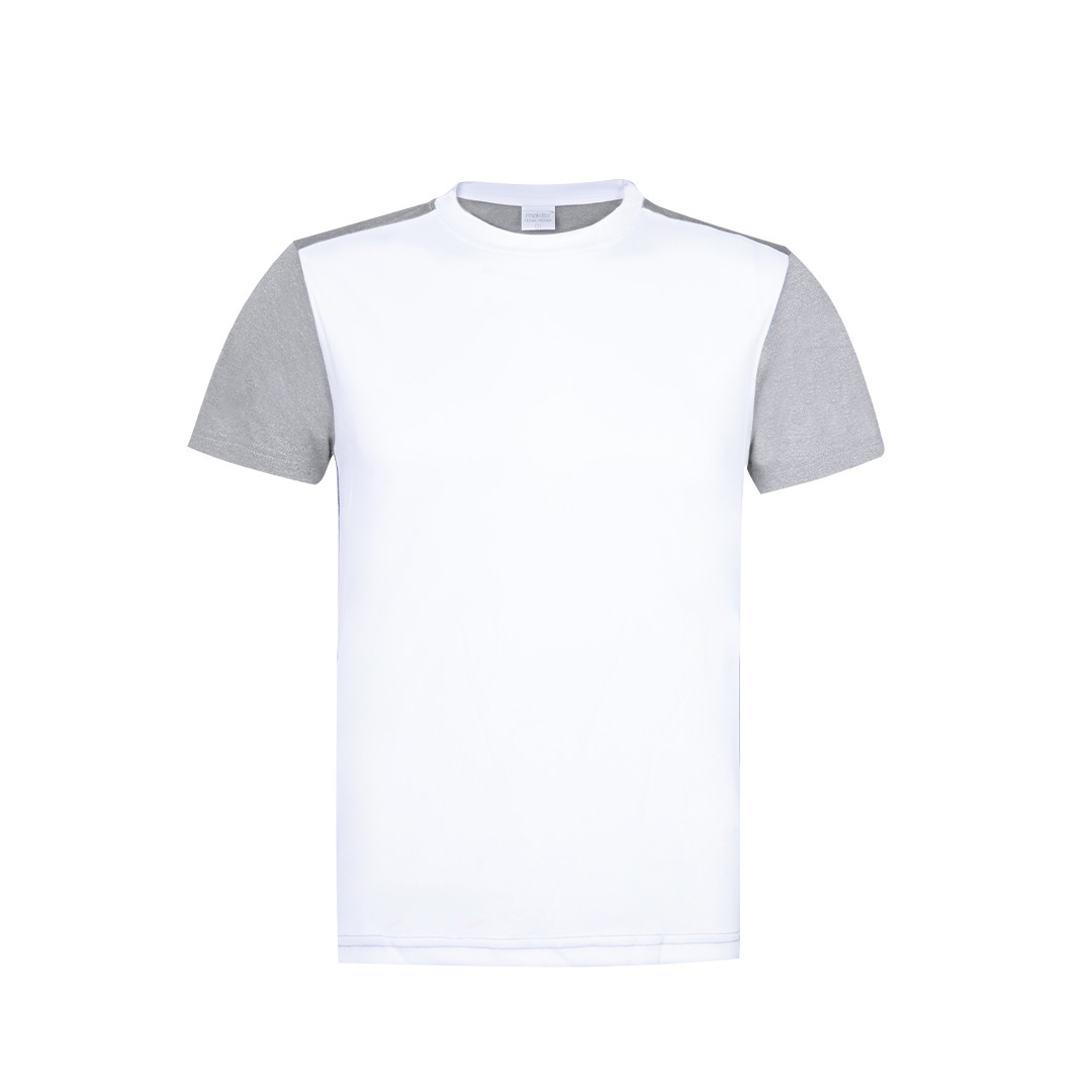 T-shirt técnico para adulto em poliéster/elastano respirável 135g/m2. Em um elegante design de duas cores, com corpo em cor branca, traseira e detalhes em cinza. Disponível nos tamanhos S, M, L, XL, XXL. Cor branca especialmente fabricada para impressão de sublimação. Respirável