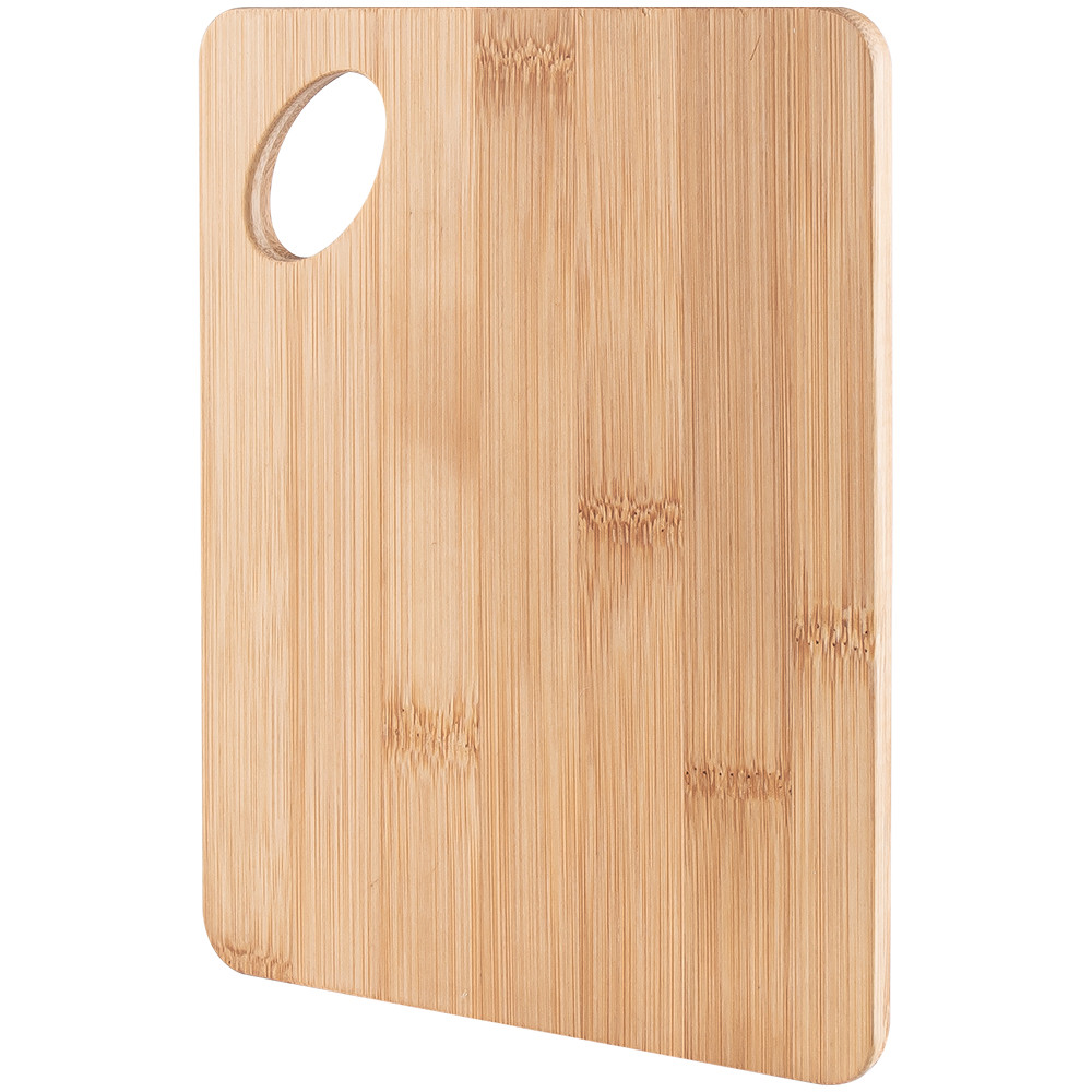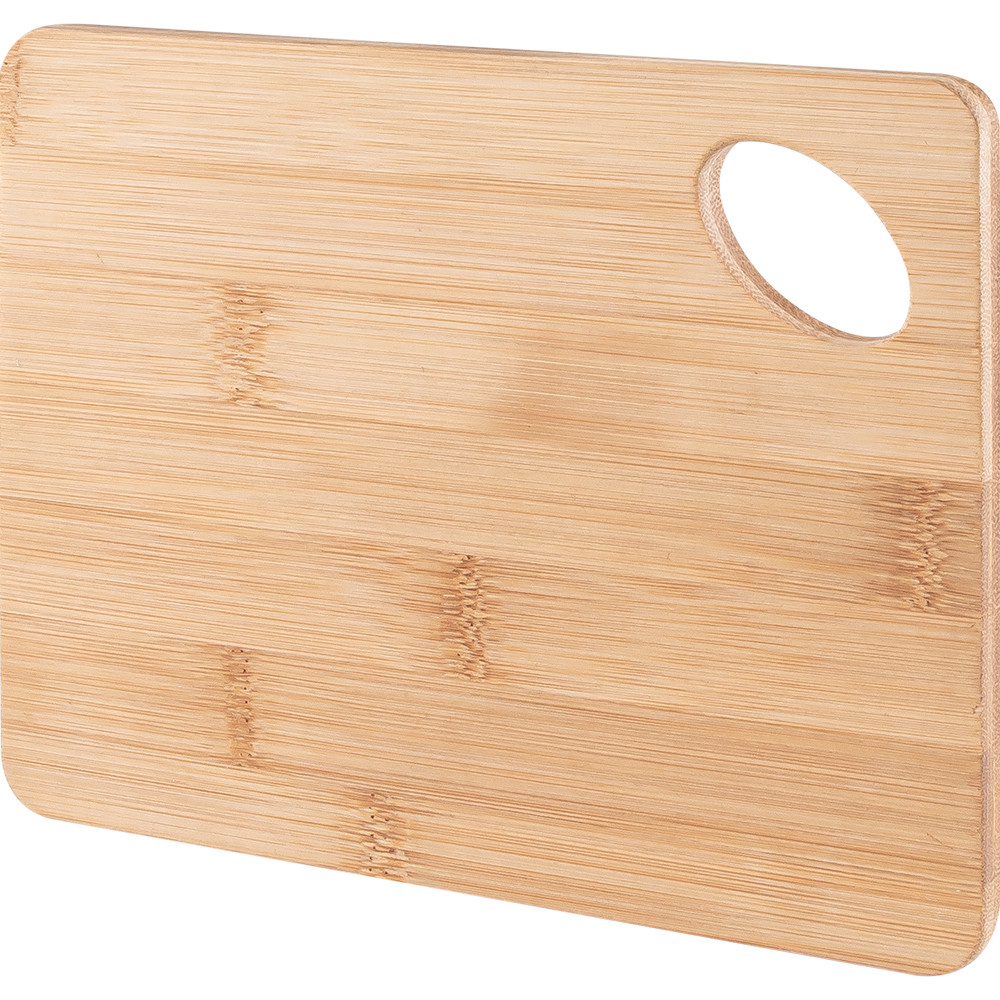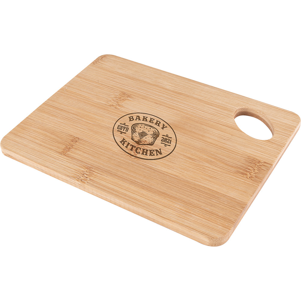 Tábua de cozinha fabricada em bambu, com furo para fácil manuseio.