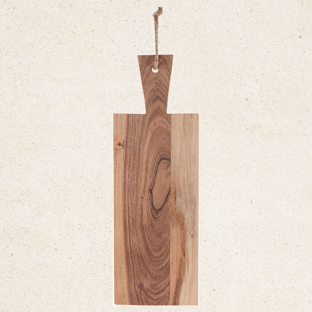 Tábua de cozinha retangular fabricada em madeira de acácia, com cordão de juta. Lavar à mão apenas e não levar ao micro-ondas. Recomenda-se lubrificá-lo antes de colocar os alimentos.