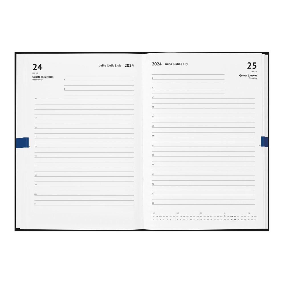 Agenda A5 em pele (58% reciclada) com fecho magné,tico. Possui um suporte para esferográfica (incluída) e marcador em fita. Está organizada num plano diário, com páginas (70 g/m²) feitas de material certificado FSC™ e outros materiais controlados. Fornecida com bolsa de non-woven. 148 x 210 mm | Bolsa: 205 x 250 mm