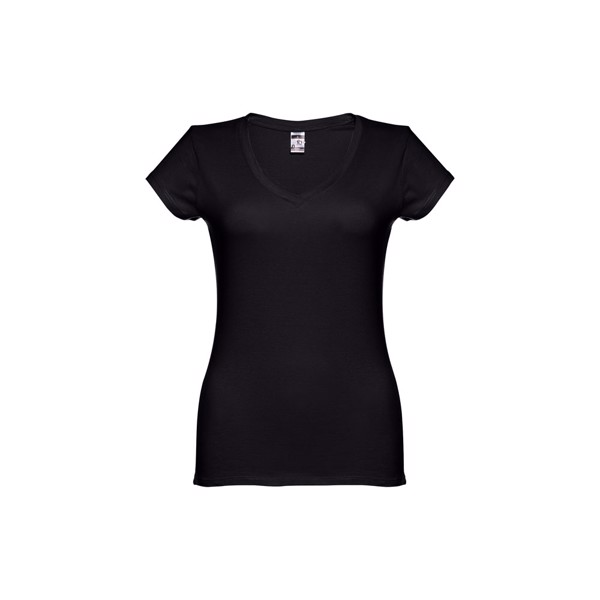 T-shirt cintada para senhora em malha jersey 100% algodão (150 g/m²) com fio de algodão cardado (cores: 194, 195 e 199: 60% algodão/40% poliéster). Contém gola em jersey com decote em “V” sobreposto, reforçada no interior com fita em jersey. Peça cortada e cosida com costura dupla nas mangas e parte inferior. Tamanhos: S, M, L, XL, XXL