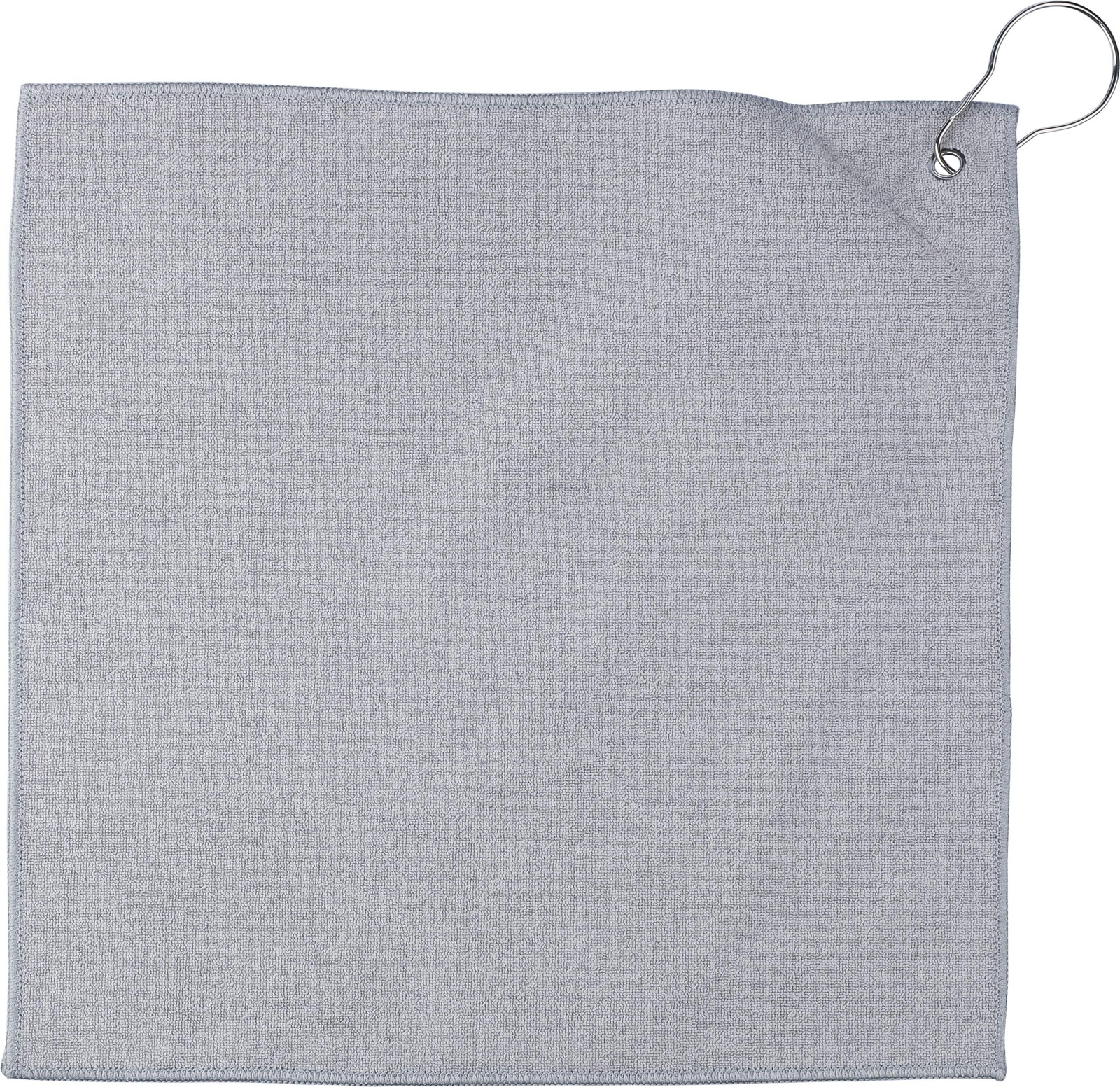Toalha de golfe rPET com uma bolsa para bolas de golfe integrada, medindo aproximadamente 31 x 31 cm. Inclui um gancho metálico para fixação fácil ao saco e uma etiqueta rPET no interior. Lavável na máquina (frio).