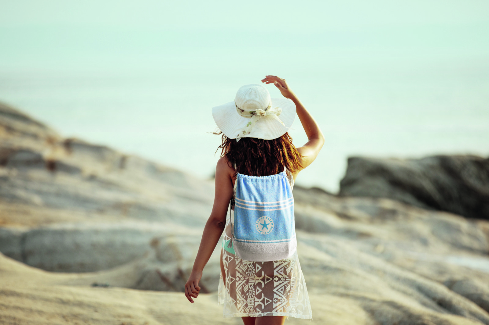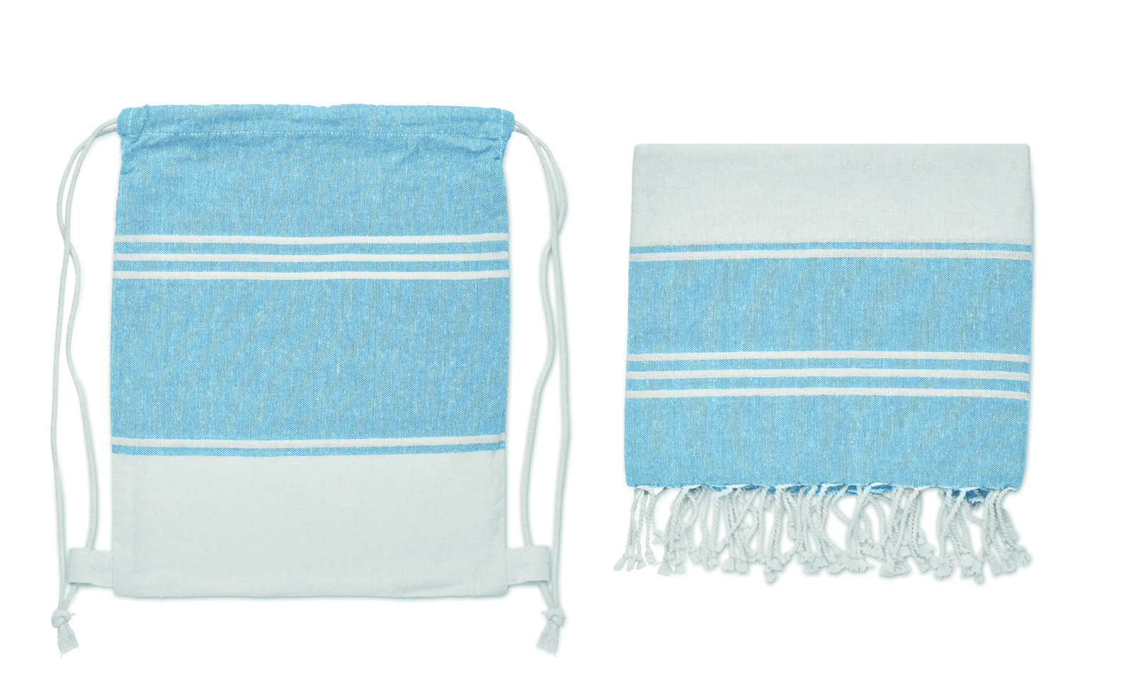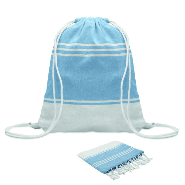 Conjunto de toalha de praia hammam com saco com cordão. 70% algodão e 30% poliéster 180 gr/m². 90x160 cm.