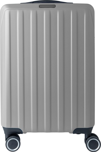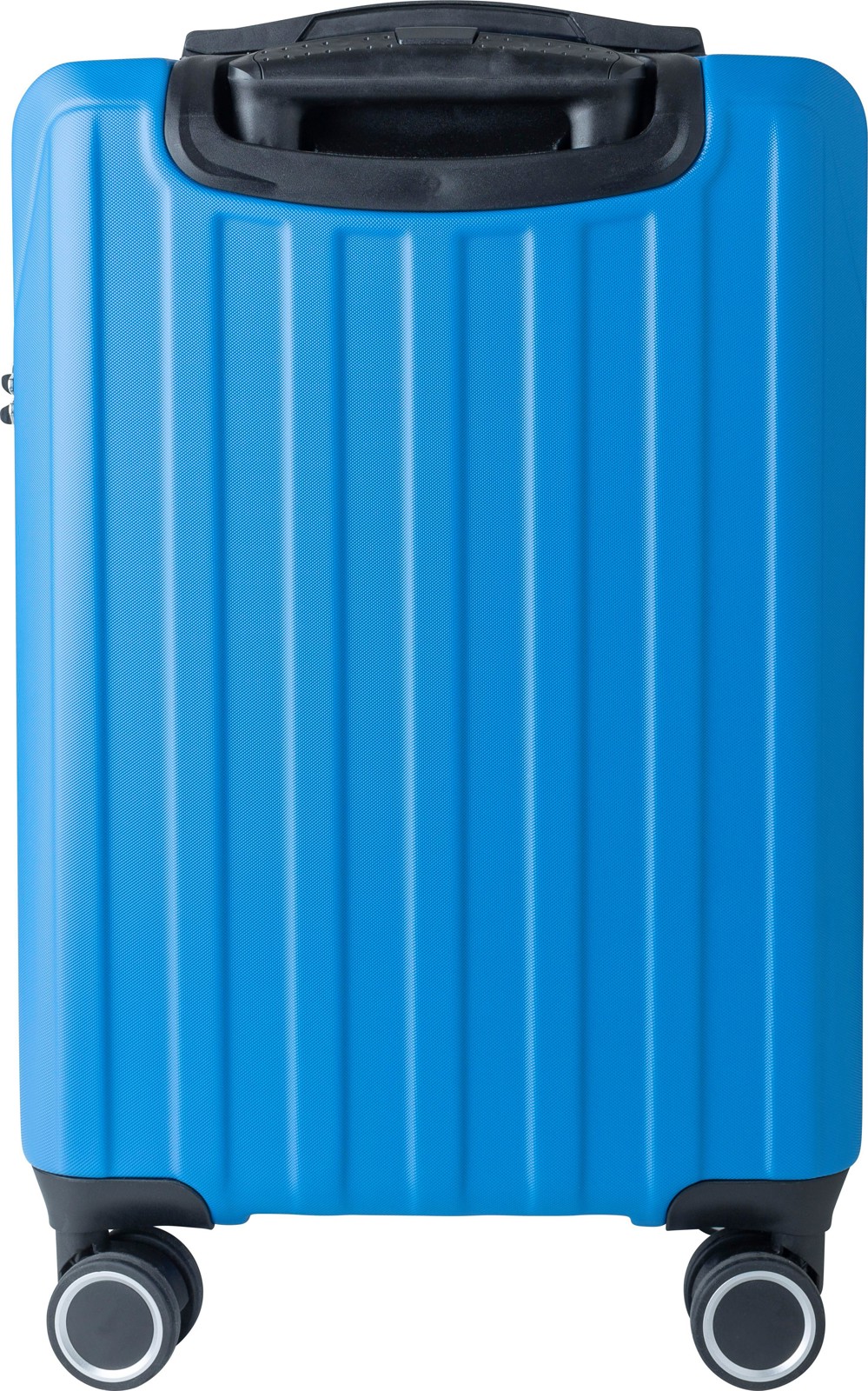 Trolley em ABS de 20 polegadas com um desenho rígido, 8 rodas (4x2) e um sistema de pega metálica de três níveis. Inclui uma pega de plástico superior, um cadeado de combinação (não TSA) e uma placa de gravação a laser com fita 3M. O interior, forrado com material 210D, tem três compartimentos: um bolso com fecho de correr em U, um bolso em rede e uma cinta em X com uma fivela. Capacidade: 30L. Embalado individualmente numa caixa de cartão castanha.