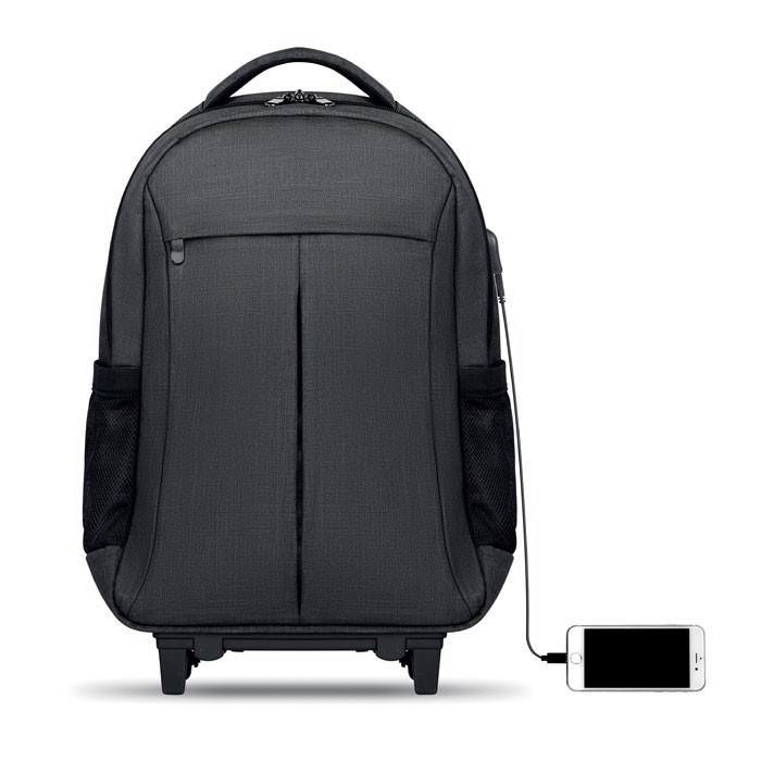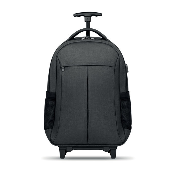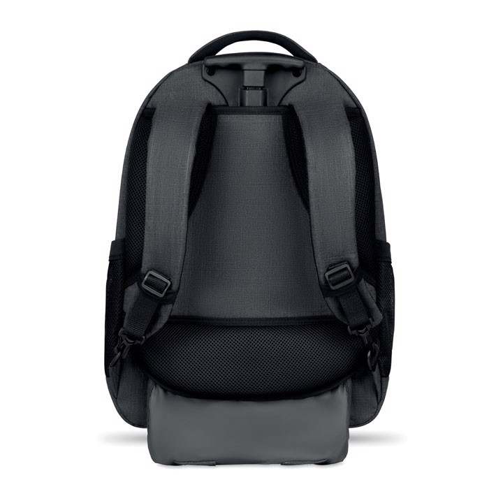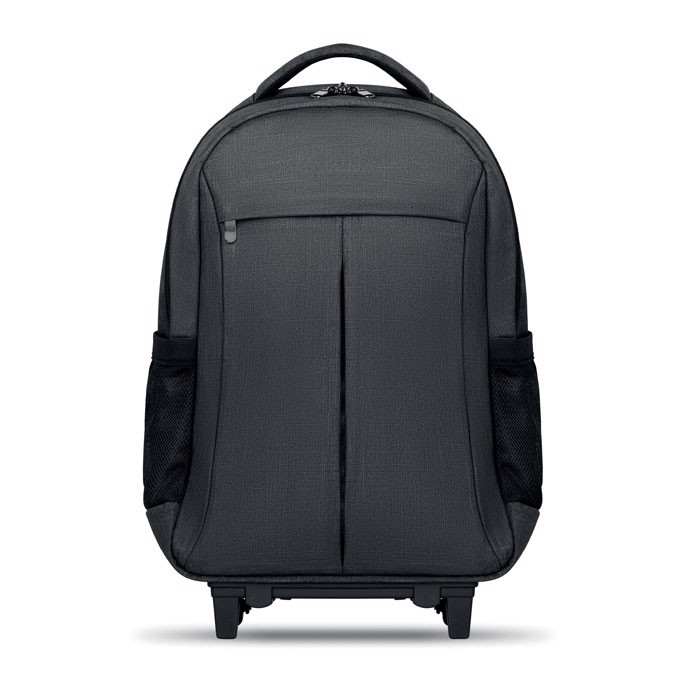 Mochila trolley em 360D 2 tons polyester. Inclui 1 compartimento interno para laptops de 15 polegadas e compartimento principal com zipper.Inclui compartimento para tablet.