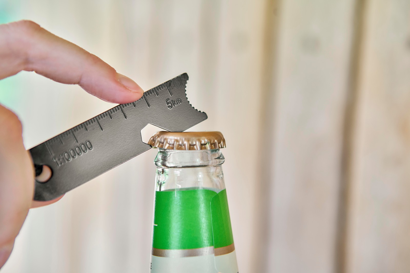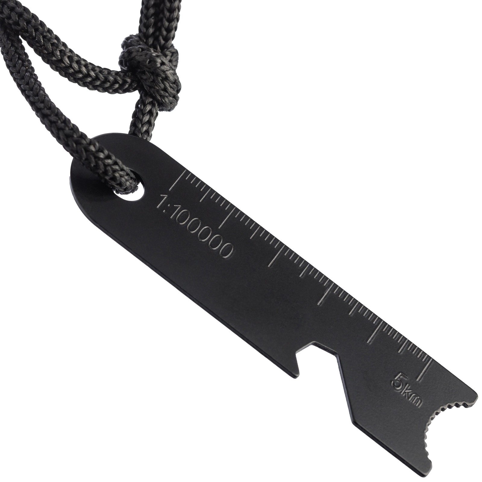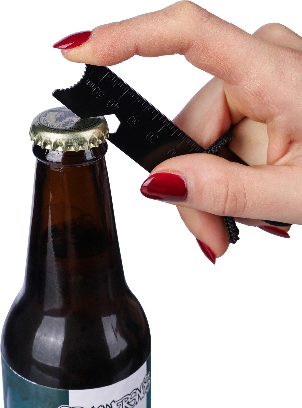 Acendedor em aço inoxidável com pega em madeira de pinho e cordão de poliéster que liga o raspador e a vareta de ignição. O raspador multifuncional inclui um abre-garrafas, uma régua de precisão e uma chave hexagonal. Para ativar, raspar o revestimento preto da vara de ignição antes de utilizar. Conjunto de duas peças. Apresentado numa caixa de cartão castanha.