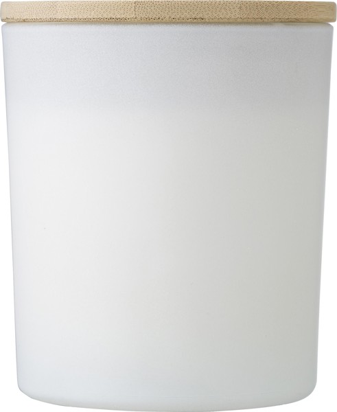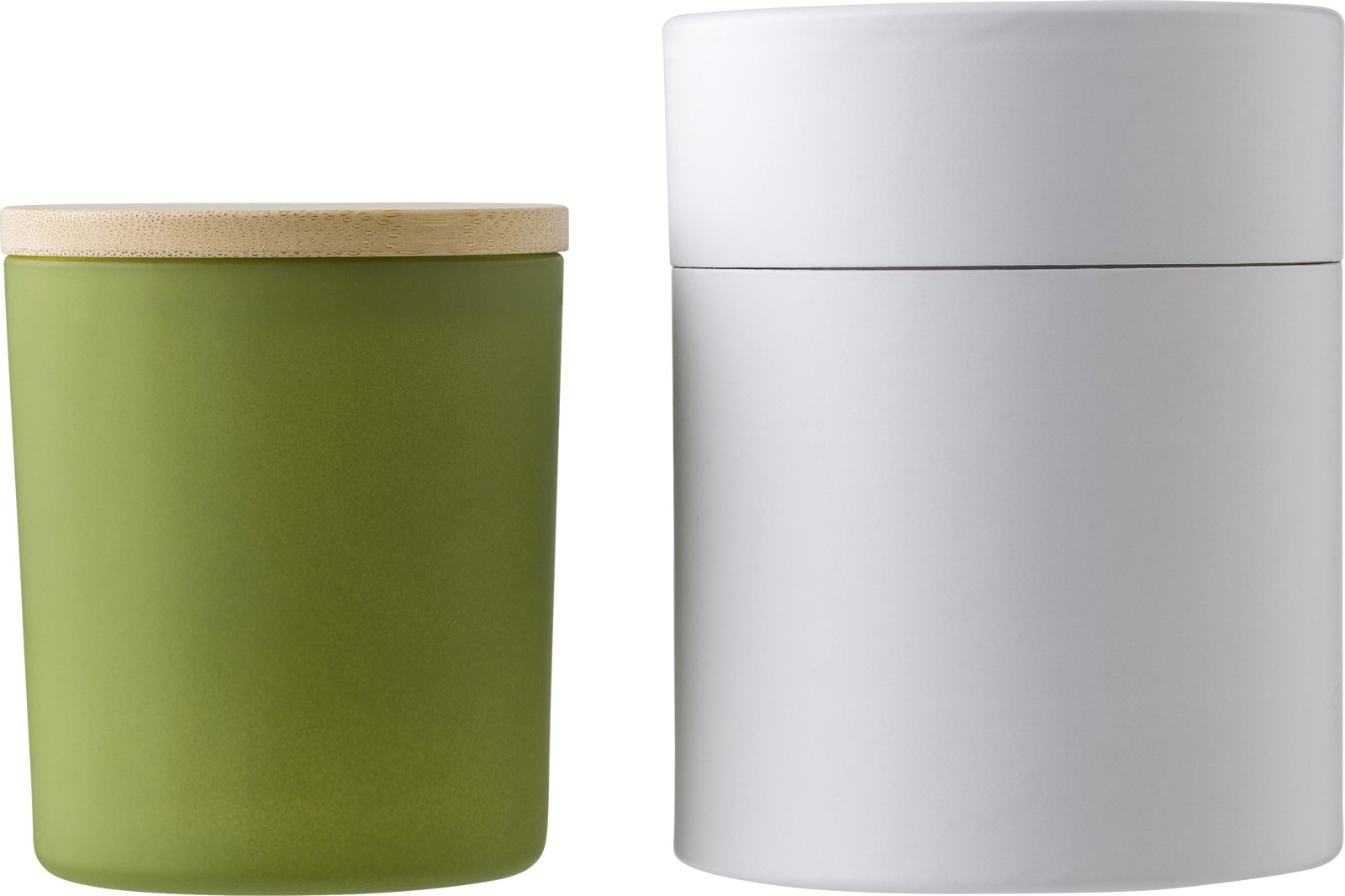 Vela de vidro com cera vegetal e uma tampa de bambu. A vela contém principalmente cera vegetal (cera de carnaúba) e tem uma duração de combustão de cerca de 46 horas. Quatro aromas consoante a cor do vidro: canela (vermelho), baunilha (branco), sândalo (preto) e jasmim (verde). Apresentado individualmente num tubo branco.