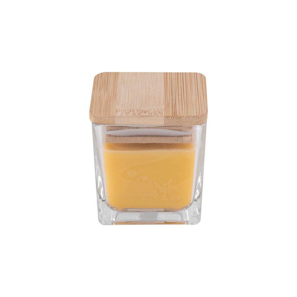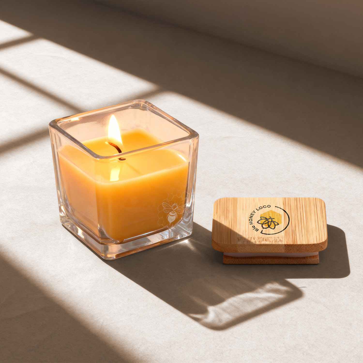 Vela de 50 gramas com tampa de bambu e design de favo de mel fabricada em 50% cera de abelha e 50% cera vegetal.