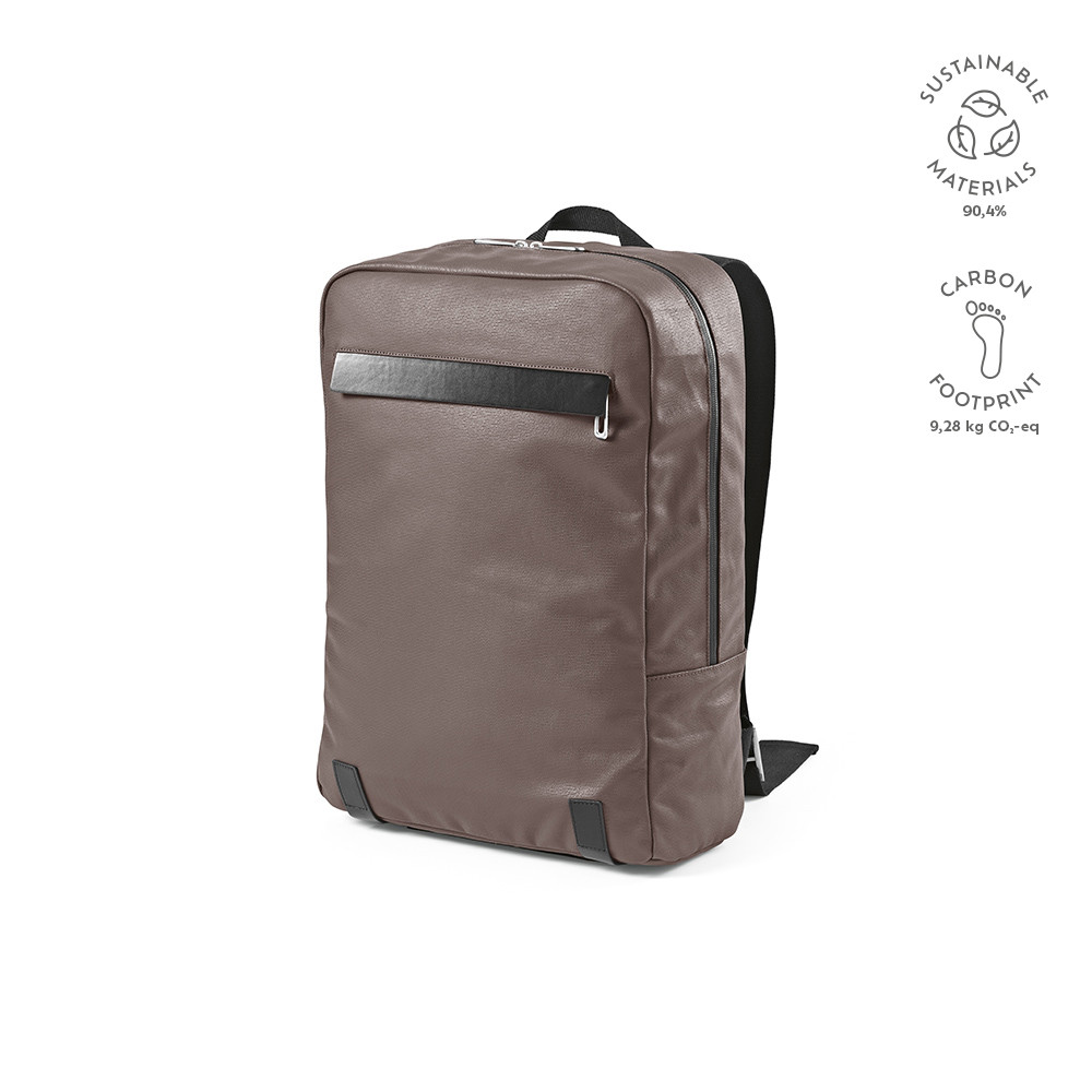 Mochila Vienna é fabricada em lona de algodão reciclado com revestimento impermeável (340gsm) e acabamentos em PU reciclado. Esta mochila de 21L inclui fechos impermeáveis e alças de algodão confortáveis. No compartimento principal encontra-se um espaço dedicado para portátil de 17" e bolsos mais pequenos para objetos pessoais. Fornecida num saco individual de algodão reciclado, refletindo o nosso compromisso com a sustentabilidade.